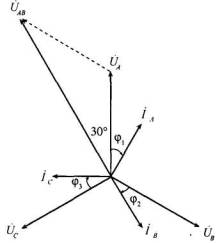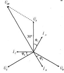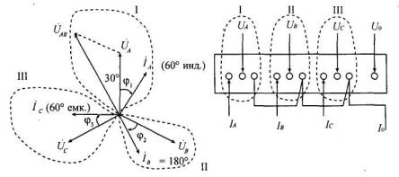 Рис. 25. Векторная диаграмма и схема присоединения проводов для измерений электрической энергии трехэлементным счетчиком (отсчет углов фазового сдвига указан по показаниям ВАФ-85М от вектора линейного напряжения UАВ) Активная мощность, измеряемая счетчиком, P = UAIAcosφ1 + UBIBcosφ2 + UCICcosφ3. Кроме того, проверяют соответствие коэффициентов трансформации измерительных ТТ и ТН, указанных на табличках, с их паспортными данными и, наконец, погрешности счетчика. На основе анализа этих данных делается вывод о правильности схемы включения и предварительный вывод о достоверности измерений электроэнергии. Положение векторов токов (см. рис. 25) IА, IВ, IC, относительно напряжений UA, UB, UC (угол фазового сдвига) определяется характером нагрузки в электрической сети потребителя. Он может иметь индуктивный, активный (cosφ = 1) или емкостный характер. На время проверки установку компенсации реактивной мощности отключают. На линиях связи положение векторов тока относительно своих напряжений определяется направлением перетоков (передачи) активной и реактивной мощности (рис. 26). Чтобы избежать ошибок в схеме подключения счетчика, необходимо перед проверкой уточнить у диспетчера энергосистемы и по показаниям щитовых приборов на подстанции направление передачи активной и реактивной мощности на проверяемом присоединении. Несмотря на это, при подключении счетчика (присоединением проводов к счетчику) можно допустить ошибку. Например возможно создание дополнительного фазового сдвига, отличающегося от действительного на 60°. На рис. 27 показана векторная диаграмма создания дополнительного фазового сдвига на 60° в индуктивность при активной нагрузке.