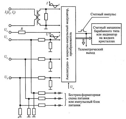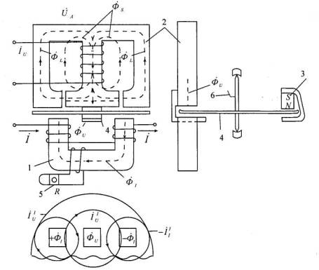 Рис. 8. Индукционный измерительный механизм Работа индукционного измерительного механизма (рис. 8) основана на создании электромагнитами напряжения 2 и тока 1 переменных магнитных потоков ФU и ФI с углом фазового сдвига между ними 90° и направленных перпендикулярно плоскости диска [9]. Магнитные потоки ФU и ФI пронизывая алюминиевый диск, индуктируют в нем вихревые токи I'I и I'U Взаимодействие магнитных потоков ФU и ФI с полем вихревых токов создает момент вращения подвижной части Мвр = kФU ФIsin(90° + φ). Магнитный поток ФU пропорционален приложенному напряжению U. Магнитный поток ФI пропорционален току нагрузки Iн. Тогда Мвр = kUIнcosφ, где k - постоянный коэффициент, определяемый конструкцией счетчика. Постоянный магнит 3 создает тормозной момент. Для компенсации трения в опорах, счетном механизме, диска 4 о воздух, червячной передаче электромагнитом 2 создается компенсационный момент, равный тормозному Мк = Мт. В результате равенства компенсационного и тормозного моментов подвижная часть при отсутствии тока нагрузки находится в состоянии динамического равновесия. Основное регулирование характеристик индукционного измерительного механизма осуществляется следующим образом: тормозного момента - механическим перемещением постоянного магнита 3; компенсационного момента - перемещением пластины магнитного шунта электромагнита 2; внутреннего угла фазового сдвига φ - перемещением зажима 5 на сопротивлении R; самохода - отгибанием флажка 6, расположенного на оси диска 4. 5. ИЗМЕРЕНИЯ ЭНЕРГИИ ЭЛЕКТРОННЫМИ СЧЕТЧИКАМИИзмерения энергии электронными счетчиками основаны на преобразовании аналоговых входных сигналов переменного тока и напряжения в счетный импульс или код. На рис. 9 представлена структурная схема электронного счетчика, основанного на амплитудной и широтно-импульсной модуляции.