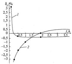 Рис. 9. Структурная схема электронного счетчика В этом счетчике отсутствуют механические вращающиеся части, тем самым исключается трение. В результате удается добиться лучших метрологических характеристик: погрешности измерений, порога чувствительности, самохода счетчика и др. В ряде электронных счетчиков вместо счетного механизма барабанного типа применяют индикатор на жидких кристаллах. Применение специализированных больших интегральных схем (БИС), микропроцессоров позволило создать многофункциональные счетчики. Они измеряют активную и реактивную энергию, а также ток, напряжение, cosφ, контролируют и запоминают графики нагрузок, отображают на индикаторе информацию о схеме включения счетчика и др. В России выпускаются электронные счетчики, не в полной мере удовлетворяющие требованиям эксплуатации, таким как: надежность и пылевлагонепроницаемость корпуса; надежность электронных элементов схемы и качество сборки счетчиков; защищенность от коммутационных и грозовых перенапряжений, особенно в распределительных сетях напряжением 380/220 В; защищенность от несанкционированного доступа и изменения схемы включения счетчика. 6.ТОЧНОСТЬ ИЗМЕРЕНИЙ ЭЛЕКТРИЧЕСКОЙ ЭНЕРГИИ СЧЕТЧИКОМТочность измерений электрической энергии счетчиком можно оценить погрешностью счетчика, которая определяется его систематической составляющей, порогом чувствительности, самоходом, точностью регулировки внутреннего угла, дополнительными погрешностями. Погрешность счетчика δс зависит от значений тока и cosφ. Зависимость погрешности от тока и cosφ называют нагрузочной характеристикой счетчика. На рис. 10 изображены нагрузочные характеристики двух индукционных счетчиков (1 и 2) типа СА3У-И670М, 100 В, 3×5 А, класс точности 2. Эти характеристики получены при проверке счетчиков на установке типа МК6801 класса точности 0,05, при cosφ = 1, частоте переменного тока 50 Гц и токах нагрузки от 25 мА до 4 А.