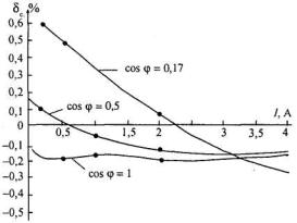 На рис. 11 изображены нагрузочные характеристики электронного трехфазного счетчика типа СЭТЗа-01-02 (100 В, 3×5 А, класс точности 1), полученные при проверке счетчика на поверочной установке типа МК6801 класса точности 0,05, в режимах, близких к эксплуатационным. Кривая на рис. 11 при cosφ = 0,17 соответствует режиму холостого хода силового трансформатора. При изменении тока и cosφ в широких диапазонах погрешность счетчика δс не выходит за допускаемые пределы класса точности.