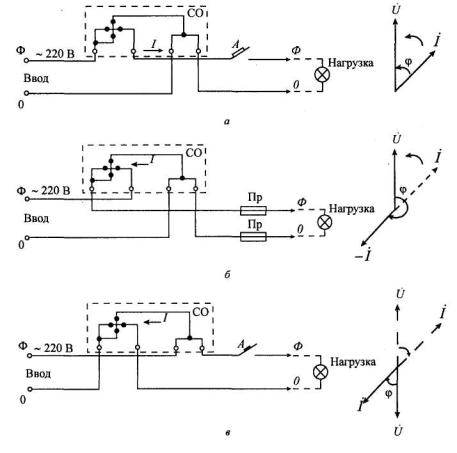 Рис. 12. Схемы включения и векторные диаграммы однофазного счетчика (а), индукционного однофазного счетчика с обратной полярностью в токовой цепи (б) и однофазного счетчика с обратной полярностью в цепи тока и напряжения (в) Кроме того, кожух счетчика выполняется прозрачным. На Ленинградском электромеханическом заводе выпускаются индукционные счетчики типа СО-ЭЭ6705 (220 В, 10-40 А) со стопором обратного хода. Схема включения счетчика существенно отличается от типовой тем, что на клеммы 1 и 3 выведены концы токовой катушки. Сетевые провода Ф (фаза) и 0 подключаются на клеммы 1 и 4 (рис. 13).