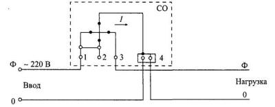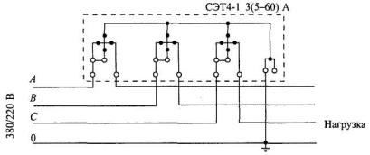 Рис. 13. Схема включения счетчика типа СО-ЭЭ6705 В ОАО «Концерн Энергомера» (г. Ставрополь) и на других заводах-изготовителях выпускаются однофазные и трехфазные электронные счетчики, которые измеряют электроэнергию независимо от полярности включения токовой цепи. Это достигается применением специально разработанной БИС преобразователя мощности. В результате этого счетчик защищен от применения фазосдвигающих устройств в электроустановках напряжением 380/220 В. 8. СХЕМЫ ВКЛЮЧЕНИЯ ТРЕХФАЗНЫХ СЧЕТЧИКОВ В ЭЛЕКТРОУСТАНОВКАХ НАПРЯЖЕНИЕМ 380/220 ВВ трехфазных четырехпроводных сетях напряжением 380/220 В для измерений электрической энергии применяют счетчики прямого (непосредственного) включения. Их называют прямоточными. Кроме того, используют счетчики, подключаемые в сеть через ТТ. Их называют универсальными или трансформаторными. Счетчики прямого включения рассчитаны на номинальные токи 5, 10, 20, 50 А. Подключение токовой цепи этих счетчиков осуществляется последовательно с сетевыми проводниками и обязательным соблюдением полярности (рис. 14). Измеряемая энергия равна разности показаний счетного механизма за расчетный (учетный) период: ΔW = ПК - ПН = ΔП. Подключение с обратной полярностью одной из токовых цепей счетчика приводит к значительному недоучету электроэнергии. Обязательно соблюдение прямого порядка чередования фаз напряжений на колодке зажимов счетчика. Изменение порядка чередования фаз напряжений на колодке зажимов счетчика осуществляется переменой мест подключения соответственно двух проводов одного элемента с двумя проводниками другого элемента.