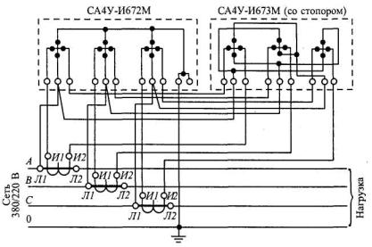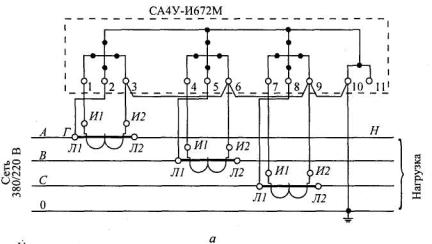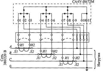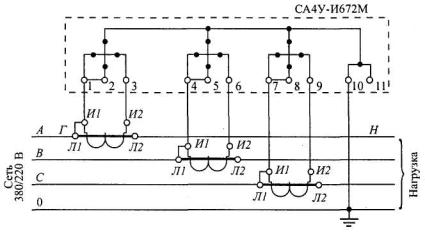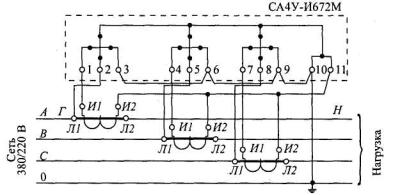 Рис. 17. Схема включения трехэлементного счетчика типа СА4У-И672М в четырехпроводной сети в «звезду». Прямой порядок чередования фаз обязателен