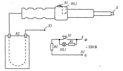 Рис. 20. Устройство нагрузочное УН-220-2: HL1 - лампа индикаторная ИН-90; R1 - резистор, 1 мОм; R2 - ТЭН, 220 В, 2 кВт; S1 - выключатель кнопочный, 10А; X1 - зажим типа «крокодил»; Х - стержень токоведущий Лампа HL1 предназначена для индикации наличия (отсутствия) напряжения на токоведущих частях электроустановки. С помощью кнопки S1 осуществляется включение (отключение) нагрузочного элемента R2 от сети. Правила применения устройства типа УН-220-2: 1) отключить нагрузку, убедиться в отсутствии самохода счетчика; 2) присоединить зажим X1 к заземленному корпусу электроустановки; 3) установить контактную часть X изолирующей рукоятки на токоведущую часть электроустановки. По свечению индикатора HL1 убедиться в наличии напряжения; 4) кратковременно нажать кнопку S1, наблюдая при этом за вращением диска счетчика. Отсутствие вращения или вращение диска в обратном направлении указывают на неисправность в схеме включения; 5) отпустить кнопку S1. Снять контактную часть изолирующей рукоятки с токоведущих частей. Отсоединить зажим X1. Включить нагрузку. На устройство типа УН-220-2 распространяются технические требования «Правил применения и испытания средств защиты», которые предъявляются к указателям напряжения и инструменту с изолированными рукоятками. Запрещается применение УН в условиях 100%-ной влажности воздуха, дождя, тумана. Перед каждым применением УН должно быть осмотрено. При хранении и перевозке УН должно предохраняться от увлажнения и загрязнения. Проверка схем включения счетчиков с помощью испытательной коробки. Согласно требованиям ПУЭ (п. 1.5.23), предусматривается установка испытательной коробки для проверки и замены счетчиков электроэнергии. Проверка схемы включения счетчика выполняется под напряжением бригадой в составе двух человек. В качестве основного защитного средства применяют отвертку с изолированной рукояткой и стержнем. В качестве дополнительного защитного средства используют резиновый коврик или диэлектрические галоши. Проверка выполняется при наличии нагрузки. Порядок проверки: 1) снимается пломба и крышка испытательной коробки; 2) проверяется наличие трех фаз напряжения как между фазами, так и между фазой и нулевым проводом; 3) проверяется отсутствие напряжения на токовых цепях. Наличие напряжения на токовых цепях указывает на повреждение ТТ; 4) с помощью отвертки перемычками на испытательной коробке закорачиваются токовые цепи. При этом должно наблюдаться замедление вращения диска счетчика; 5) ослабляются винты контактных перемычек цепей напряжения, создается видимый разрыв и снимается напряжение со счетчика. Проверка схемы включения индукционных счетчиков осуществляется поочередно подачей напряжения и тока соответствующих фаз на измерительный элемент счетчика. Вращение диска в прямом направлении указывает на исправность ТТ, цепей учета и счетчика, но не дает полной уверенности в правильности схемы включения. Активную мощность, Вт, и реактивную мощность, вар, измеряемые индукционным и электронным счетчиками с помощью секундомера, рассчитывают по формулам