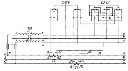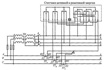 Рис. 24. Схема включения трехэлементных счетчиков активной и реактивной энергии в четырехпроводную цепь с тремя ТТ и заземленной фазой b ТН. Прямой порядок чередования фаз ABC обязателен. (Цепи напряжения электронных счетчиков показаны условно)