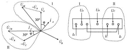 вычисляют мощности и 10. СХЕМЫ ВКЛЮЧЕНИЯ ТРЕХФАЗНЫХ СЧЕТЧИКОВ В ЭЛЕКТРОУСТАНОВКАХ НАПРЯЖЕНИЕМ ВЫШЕ 1000 ВВ трехфазных трехпроводных сетях напряжением 6 - 10 кВ и выше для измерений электроэнергии применяют двухэлементные счетчики активной энергии типа СА3У-И670М, измерительные ТТ и трансформаторы напряжения (ТН), включенные по схеме, приведенной на рис. 22). Измерение электроэнергии двухэлементным счетчиком СА3У-И670М рассмотрим на векторной диаграмме (рис. 23) линейных напряжений UAB = UCB = 100 В и токов IA = IC = 1 А с углом фазового сдвига φ = 30°.