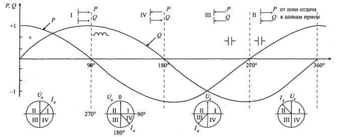 Рис. 26. Положение вектора тока фазы А в зависимости от направлений передачи активной и реактивной мощности