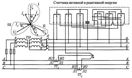Эта зависимость справедлива для коэффициента мощности cosφ, равного единице. Токи измеряют с помощью токоизмерительных клещей в первичной или во вторичной цепи ТТ. При правильной схеме включения, соответствии коэффициента трансформации KI расчетному и работе счетчика в своем классе точности время t1об будет незначительно отличаться от времени одного оборота счетчика, измеренного секундомером. Для десятипроводной схемы включения счетчика описанные методы проверки не дают полной уверенности в ее правильности. Для того чтобы убедиться в правильности схемы включения, снимают векторную диаграмму при известном характере нагрузки или там, где это возможно, визуально проверяется соответствие подключения проводов фаз напряжений своим фазным токам. Там, где визуально проследить прохождение проводов невозможно, электроустановку отключают и выполняют прозвонку проводов вторичных цепей тока и напряжения. После проверки цепей правильность учета контролируют вышеописанными способами. Определение