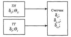 Рис. 30. Основные составляющие погрешности измерительного комплекса: δU - погрешность напряжения ТН, %; θU - угловая погрешность ТН, мин; δI - токовая погрешность ТТ, %; θI - угловая погрешность ТТ, мин; δл - погрешность из-за потери (падения) напряжения в линии связи, % Uном; δс - погрешность счетчика, %; δо.п. - погрешность отсчета показаний счетчика; δсi - дополнительная погрешность счетчика, вызванная влиянием i-й внешней величины; l - число внешних влияющих величин Предел допускаемой относительной погрешности измерительного комплекса рассчитывают по формуле [6]