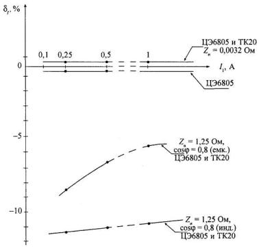 Влияние дистабилизирующих факторов на погрешность измерений электроэнергии рассмотрено в [19]. На рис. 31 приведены экспериментальные зависимости токовой погрешности δI разделительных (промежуточных) ТТ типа ТК-20 (класс точности 0,5, коэффициент трансформации 5/5, мощность S = 5 В·А), включенных совместно со счетчиком типа ЦЭ6805 (100 В, 5 А, класс точности 0,5). Эти погрешности определены на установке для поверки счетчиков типа МК6801 (класс точности 0,05 при разных значениях коэффициента мощности и нагрузки вторичных цепей ТТ). В качестве нагрузки использованы токовые цепи индукционных счетчиков типа СА3У-И681.