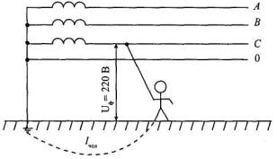 Рис. 34. Схема прикосновения человека к одной фазе в четырехпроводной сети с заземленной нейтралью При наиболее неблагоприятных условиях, когда человек прикоснувшийся к фазе, имеет на ногах токопроводящую обувь (сырую), стоит на сырой земле или на токопроводящем полу, значение тока будет равно
