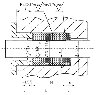 Рис. 1 1.3. Поверхности грундбуксы, подсальникового кольца, не должны иметь сколов и фасок. Острые кромки притупить, но не закруглять. 1.4. Для исключения потери герметичности сальникового уплотнения не рекомендуется применение грундбуксы и подсальникового кольца со скошенными торцами (15°). 1.5. Схема уплотнительного узла отображена на Рис. 1. 1.6. При наличии скосов, фасок и зазоров свыше требуемых рекомендуется установка крайних колец из углеродной набивки НУ-201 (УНФ). 2. ОБЩИЕ УКАЗАНИЯ ПО УСТАНОВКЕ2.1. Перед установкой новых колец набивки необходимо удалить старые кольца набивки или их остатки. 2.2. Вал или защитную втулку необходимо проверить на износ и при слишком сильных повреждениях заменить. 2.3. При наличии в сальнике фонарного кольца, зазор между валом и отверстием фонарного кольца не должен превышать 0,02 S. 2.4. Если сальниковая камера имеет большую глубину, изготовить по месту подсальниковое кольцо. Высота подсальникового кольца x определяется как разность между глубиной сальниковой камеры L и суммой высоты сальникового пакета Н, состоящего из 4-6 колец набивки, подпрессованных на 25 % и 1/3 длины рабочей части грундбуксы l. (Рис. 1). x = L - (H + 1/3 l) Внутренний и наружный диаметр подсальникового кольца вычисляется по формулам; Dк = D - 0,2 (мм) dк = d + 0,2 (мм) Пример: