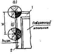 Черт. 6 Длинное ребро 1 (черт. 6) поверочного угольника, расположенного на рабочей поверхности предметного стола, установите параллельно направлению движения каретки продольного перемещения с помощью регулировочных винтов стола. Микрометрическим, винтом каретки продольного перемещения. совместите перекрестие штриховой сетки с изображением короткого ребра 2 угольника, отступив 0,2-0,5 мм от- вершины угла угольника (см. Черт. 6,а).Зная из свидетельства о поверке угольника аД - действительное значение угла 90° в градусах; вычислите отклонение от перпендикулярности угольника Δhу линейной мере: