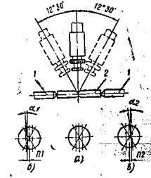 Черт. 12 3.4.28. Определение радиального биения центров при вращении скалок. К плоской поверхности центра 1 (черт. 12), установленного в одной из скалок, подведите до упора острие проверяемого центра 2, установленного во второй скалке, совместите горизонтальную линию штриховой сетки и острие центра. Нажмите клавиши 3, ВВОД на пульте управления. Поверните скалку на 360° и отметьте наибольшее смещение а острия центра относительно перекрестия штриховой сетки, которое и определяет биение центра. В этом положении вновь совместите горизонтальную линию штриховой сетки и острие центра и нажмите клавиш ВВОД. Цифропечатающее устройство отпечатает значение а. Определив биение всех центров, находящихся в комплекте, в сочетании с одной скалкой, выполните эту операцию со второй скалкой. Радиальное биение центров не должно превышать 0,005 мм. 3.4.29. Определение отклонения от параллельности линии центров направлению движения каретки продольного перемещения. Отклонение от параллельности определяйте при следующих положениях бабок и скалок: для валика 20 мм - при сдвинутых бабках и наибольших вылетах скалок; для валика 500 мм: 1) при полностью раздвинутых бабках и наибольшем вылете скалок; 2) при сдвинутых к краю правой бабке и к центру левой бабке и наименьших вылетах скалок; 3) при сдвинутых к краю левой бабке и к центру правой бабке и наименьших вылетах скалок; для валика 200 мм: 1) при бабках, находящихся в среднем положении, и наибольших вылетах скалок; 2) при симметрично расположенных бабках и наименьших вылетах скалок; 3) при сдвинутой к центру левой бабке и наибольшем вылете скалки и среднем положении правой бабки и наименьшем вылете скалки; 4) при сдвинутой к центру правой бабке и наибольшем вылете скалки и среднем положении левой бабки и наименьшем вылете скалки. Проверку производите при перемещении каретки на 20 и 200 мм. Отклонение от параллельности в вертикальной плоскости определите следующим образом. Наденьте измерительную головку с помощью кронштейна К1 на объектив визирной системы и установите ее так, чтобы ось наконечника была расположена вертикально. Переместите каретки прибора так, чтобы наконечник измерительной головки расположился против одного из концов валика на расстоянии приблизительно 0,5-1 мм от торца, и приведите наконечник в контакт с поверхностью валика. Для исключения влияния биения скалок предварительно, до начала проверки, приведите скалки, вращая их, в положение наибольшего или наименьшего биения. Передвигая микрометрическим винтом каретку поперечного перемещения, получите наибольшее показание по шкале измерительной головки, затем, сдвинув каретку продольного перемещения на длину валика, аналогичным способом найдите наибольшее показание в требуемом сечении на другом конце валика. Разность наибольших показаний по шкале измерительной головки в двух точках валика, отстоящих одна от другой на расстояние 20 или 200 мм, соответствует отклонению от параллельности линии центров в вертикальной плоскости на этих длинах. При определении отклонения от параллельности линии центров в горизонтальной плоскости расположите измерительную головку так, чтобы ось наконечника была горизонтальна, и при ведите плоскость наконечника в контакт с образующей валика примерно в его горизонтальном диаметральном сечении. Медленно перемещая кр