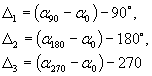При отсутствии круглого стола погрешность угломерной головки определите с помощью поверочного угольника, для чего установите его на предметном столе прибора так, чтобы длинное ребро было параллельно направлению движения каретки продольного перемещения. Изображение короткого ребра угольника совместите с вертикальной центральной штриховой линией сетки микрометрическим винтом каретки продольного перемещения и снимите отсчет а0' по шкале угломерной головки. Поворачивая штриховую сетку на 90, 180, 270, 360°, совмещайте последовательно центральную штриховую линию с изображением ребер угольника, снимая отсчеты a90, а180, а270, a0". Совмещение и снятие показаний повторите по пять раз для каждого положения сетки и вычислите средние арифметические значения, а затем среднее арифметическое а0 показаний а0' и а0", соответствующих положению лимба в начале и конце измерения. Погрешность угломерной головки определите по формулам