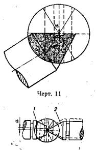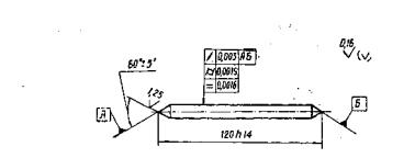 Разность между наибольшим и наименьшим значениями не должна превышать ± 1'. Центровые бабки со скалками и центрами 3.4.26. Определение радиального биения скалок при любом их вылете относительно бабок. До начала проверки сдвиньте соответствующую бабку до упора по направлению к оси прибора и закрепите ее. Биение определяйте при трех положениях (вылетах) каждой скалки: l1 = 20 мм; l2 = 50 мм и l3 = 90 мм. Открепив стопорные винты скалки и выдвинув ее на требуемую длину (l1, l2 или l3), подведите к образующей скалки наконечник измерительной головки, закрепленной в кронштейне К1. Осторожно вращая скалку, снимите отсчеты по шкале измерительной головки. Разность между наибольшим и наименьшим отсчетами определяет величину биения скалки. Величина радиального биения не должна быть более 0,002 мм для приборов, выпускаемых из производства и ремонта, и 0,003 мм для приборов, находящихся в эксплуатации. 3.4.27. Определение износа прямых центров. Расположите скалку с проверяемым центром в призме на предметном столе. Совместите штриховую линию сетки с изображением образующей конуса проверяемого центра, который предварительно, перемещая скалку, выставьте так, чтобы образующая конуса центра была параллельна горизонтальной линии штриховой сетки при ее нулевом положении, после чего скалку закрепите на столе струбциной. Нажмите клавиши 3, ВВОД на пульте управления. Вращая центр в скалке, найдите и, нажав на пульте управления клавиш ВВОД, измерьте наибольшее отклонение от прямолинейности а (черт. 11). При проверках следите за состоянием острия центра; на нем не должно быть заусенцев, зазубрин, вмятин, оно должно быть заостренным. Отклонение а измерьте не менее трех раз, после чего нажмите клавиш 4. Цифропечатающее устройство отпечатает среднее арифметическое значение результатов измерений, которое не должно превышать 0,01 мм для приборов, находящихся в эксплуатации.