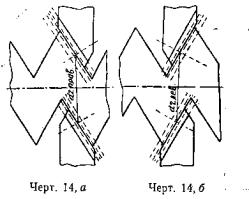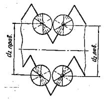 где γ - среднее арифметическое результатов измерения плоского угла; γД - действительное значение угла меры из свидетельства о ее поверке. Погрешность Δ4 прибора по должна превышать пределов допускаемом погрешности, указанных и табл. 3. 3.4.46. Определение погрешности Δ5 прибора при измерении методом осевого сечения среднего диаметра резьбового калибра. Для определения погрешности Δ5 используйте бинокулярную насадку. Осветительную диафрагму установите удобной для наблюдателя, увеличение прибора -30. Перед измерением обязательно проверьте прилегание измерительного ножа к образующей профиля резьбы, наклоняя колонку на угол подъема резьбы. - При измерении среднего диаметра и угла профиля резьбы колонку установите на 0°00'. Закрепите на наружной части оправы объектива насадку с полупрозрачной пластиной. Поместите на каждую опорную поверхность каретки продольного перемещения планки с измерительными ножами Сфокусируйте визирную систему на плоскость осевого сечения, при этом в поле зрения одновременно должны наблюдаться резкие изображения теневого контура центров и рисок измерительных ножей. Не изменяя фокусировки прибора, установите в центрах резьбовой калибр. Измерьте значения d2прав (черт. 14, а) и d2лев (черт. 14,6) одного и того же витка резьбового калибра, прикладывая соответствующий измерительный нож. При измерении значения d2прав разверните штриховую сетку так, чтобы центральная штриховая линия ее была параллельна риске ножа, и, пользуясь микрометрическими винтами кареток, совместите штриховую линию, отстоящую от центральной на 0,9 мм, с риской правого ножа, после чего нажмите клавиши 3 и ВВОД на пульте управления. Проследите, чтобы в исходном положении перекрестие штриховой сетки делило пополам измеряемую сторону профиля. Передвиньте каретку поперечного перемещения до появления в поле зрения диаметрально противоположной стороны профиля того же витка резьбы. Приложите тот же правый нож к параллельной правой стороне профиля, строго контролируя плотное прилегание ножа. Совместите вторую штриховую линию, тоже отстоящую на 0,9 мм от центральной риски ножа, нажмите клавиш ВВОД. Цифропечатающее устройство отпечатает значение, соответствующее значению d2прав. Произведите не менее трех таких измерений. Помните, что после первого наведения на профиль резьбы каретку продольного перемещения сдвигать нельзя. Аналогично определяйте d2лев, применяя в этом случае левый измерительный нож и разворачивая штриховую сетку параллельно левым сторонам профиля резьбы. Предварительно микрометрическим винтом каретки продольного перемещения переместите калибр на 0,5 шага так, чтобы левая сторона того же витка приблизилась к перекрестию штриховой сетки. Наберите на цифровой клавиатуре пульта управления действительное значение среднего диаметра резьбы, взятое из свидетельства о поверке калибра. Нажмите клавиш 4. Цифропечатающее устройство отпечатает среднее арифметическое значение результатов измерения среднего диаметра и их разность, которая определяет погрешность измерения среднего диаметра без учета поправки на износ ножей.