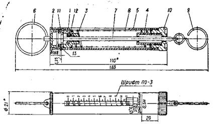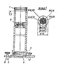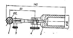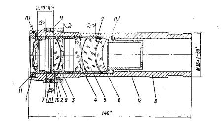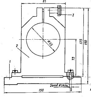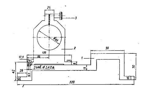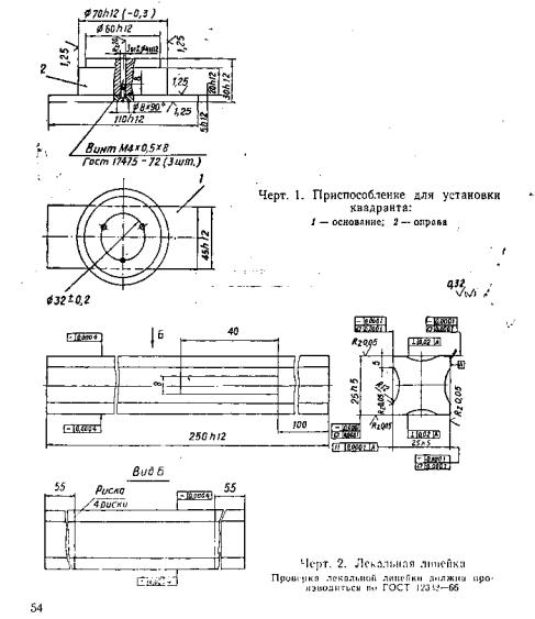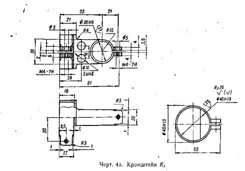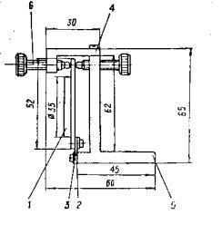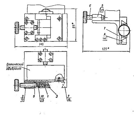 Черт. 4,б. Держатель к кронштейну К1: 1, 2 - держатель; 3, 4 - винты. Материал – лист АМГ2-10 ГОСТ 21631-76 Черт 5. Кронштейн K2: 1 - основание; 2 - кронштейн; 3 – винт Черт. 6. Контрольное зеркало: 1 - зеркало в оправе: 2 - пружина; 3 – планка; 4. 5 – угольники; 6 – винт. Черт. 7 Кронштейн К3 1- скоба; 2 - кронштейн; 3 - винт Черт. 8 Динамометр 1 - указатель; 2 - крышка; 3 - направляющая; 4 - втулка; 5 - гильза; 6 - кольцо; 7 - шток; 8- пружина; 9 - крючок; 10 - гайка; 11 - гайка; 12 - винт Ml,2×5.56.04 ГОСТ 17475-72; 13 - штифт 1h8×5 ГОСТ 3128-70 Динамометр при тарировании должен быть свободно подвешен за кольцо 6. Для тарирования применяются гири 5-го класса по ГОСТ 7328-65. Пружина 8 должна быть предварительно поджата на 2+1 мм. На черт. 8 и остальных звездочкой отмечены размеры, приведенные для справок. Черт. 9 Кронштейн К4 1 – опора; 2 – основание; 3 – каретка; 4 – направляющая; 5, 6 – винт; 7 – угольник;, 8, 9, 10 – планка; 13, 14, 15, 16 - винт Черт.10 Коллиматор с допусковыми концентрическими окружностями: 1 – матовый экран в оправе; 2, 3 – линзы в оправе; 4 – диафрагма; 5 – основание; 6 – регулировочные винты основания. Черт. 11 Приспособление для проверки параллельности осей: 1, 2, 3, 4, 5, 6 - линзы в оправах; 7 - кольцо; 8 - корпус; 9 - кольцо; 10 - установочное кольцо; 11 -кольцо; 12 - диафрагма; 13 – винт.