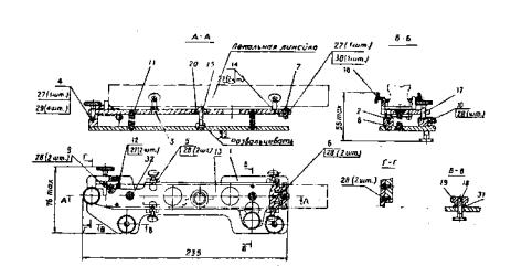 Черт. 2, б Приведите сферический наконечник измерительной головки в контакт с рабочей поверхностью поверочной линейки, установленной на передней (задней) опорной поверхности каретки (черт. 3). Передвигая каретку продольного перемещения, наблюдайте показания по шкале измерительной головки. Разность А (Б) показании, полученных при контакте наконечника с крайними точками передней (задней) поверхности каретки, соответствует отклонению от параллельности передней (задней) опорной поверхности. Алгебраическая разность значений А и Б соответствует отклонению от параллельности передней и задней опорных поверхностей между собой.