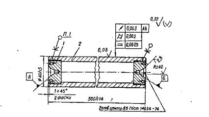 Черт. 13. Валик. Материал - сталь ХВГ ГОСТ 5950-63, НВС58...63: 1 - вкладыш, ставить на клей БФ-2 или БФ-4 по ГОСТ 12172-74; 2 - валик Черт. 14 Валик. Материал – сталь ХВГ ГОСТ 5950-63, НВС58…63 |