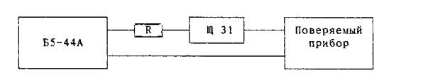 К ИPT-5310L, ИPT-5320L, ИPT-5321L, PTЭ-5250L, PTЭ-5260L присоединяют магазины сопротивлений, к ИРТ-5310МВ, ИРТ-5320МВ, ИРТ-5321МВ, РТЭ-5250МВ, РТЭ-5260МВ присоединяют компараторы напряжений при помощи калибровочного кабеля. На магазинах сопротивлений устанавливают последовательно значения сопротивлений, соответствующие поверяемым точкам ИPT-5310L, ИPT-5320L, ИPT-5321L, PTЭ-5250L, PTЭ-5260L, и измеряют температуры поверяемыми приборами. На компараторах напряжений устанавливают последовательно значения т. э. д. С., соответствующие поверяемым точкам ИРТ-5310МВ, ИРТ-5320МВ, ИРТ-5321МВ, РТЭ-5250МВ, РТЭ-5260МВ, и измеряют температуры поверяемыми приборами. За нормирующее значение принимают разность верхнего и нижнего значений измеряемой величины. Наибольшее из рассчитанных значений основной погрешности измеряемой величины не должно превышать значения, указанного в табл.2. 5.5.4. Основную приведенную погрешность измерений температуры для TM-5231L, ТМ-5231МВ определяют по методике п. 5.5.2 последовательно для каждого измерительного канала, для чего: 1) к поверяемому измерительному каналу TM-5231L присоединяют магазин сопротивлений, а к остальным каналам сопротивления с номинальными значениями равными сопротивлению термопреобразователь при 0 ºС; 2) к поверяемому измерительному каналу ТМ-5231МВ присоединяют компаратор напряжений при помощи калибровочного кабеля, входные клеммы остальных каналов соединяют с общим проводом. Основную погрешность рассчитывают в соответствии с п. 5.5.3. 5.5.5. Для определения основной погрешности измеряемой величины (для ИРТ-5310МА,-5320МА,-5321МА, РТЭ-5250МА,-5260МА) поверяемый прибор соединяют с Б5-44А, Щ 31 и сопротивлением R=2 КОм по схеме, приведенной на рис. 5.1.