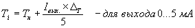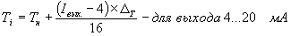 где Авых. - значение выходного сигнала при соответствующем значении входного сигнала; Авых.р - расчетное значение выходного сигнала при том же значении входного сигнала; Ан - нормирующее значение выходного сигнала. Основную приведенную погрешность определяют в точках соответствующих О, 20, 40, 60, 80, 100 % диапазона изменений выходного сигнала для выхода 0...5 мА и 0, 25, 50, 75, 100 % диапазона изменений выходного сигнала для выхода 4...20 мА. Значения температур в поверяемых точках Ti определяют по формулам
