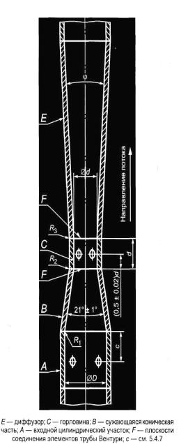 из двух значений - D или 0.25D + - внутренняя поверхность входного цилиндра А может быть не обработана, если ее качество такое же, как качество поверхности входной конической части В; - R1 = 1,375 D ± 0,275 D; - R2 = 3,625d ± 0,125 d; - длина цилиндрической части горловины должна быть не менее d/3; - длина цилиндрической части горловины, находящейся между концом радиуса R2 и плоскостью, проходящей через оси отверстия для отбора давления, также как и длина цилиндрической части между плоскостью, проходящей через оси отверстий для отбора давления, и началом радиуса R3 должна быть не менее d/6 (для длины горловины также см. 5.2.4); - радиус R3 должен быть от 5 d и до 15 d, оптимальное значение равно 10 d (если выбрано не оптимальное значение, то рекомендуется при малых углах φ устанавливать значение радиуса R3 более 10 d). 5.2.9 Профиль трубы Вентури с обработанной входной конической частью имеет следующие характеристики: - минимальная длина входного цилиндрического участка должна быть равна D; - R1 должен быть менее 0.25 D и предпочтительно равен нулю; - R2 должен быть менее 0,25 d и предпочтительно равен нулю; - длина цилиндрической части горловины, находящейся между концом радиуса R2 и плоскостью, проходящей через оси отверстия для отбора давления, должна быть не менее 0,25 d; - радиус R3 должен быть менее 0,25 d и предпочтительно равен нулю. Поверхность входного цилиндрического и сужающегося конического участков обрабатывают так же, как и поверхность горловины (см. 5.2.7). - минимальная длина входного цилиндрического участка А должна быть равна D; - между цилиндрическим участком А и входным конусом В не должно быть переходных кривых, кроме образуемых за счет сварки; - между входным конусом В и горловиной С не должно быть переходных кривых, кроме образуемых за счет сварки; - между горловиной С и диффузором Е не должно быть переходных кривых; - внутренняя поверхность участков А и В должна быть чистой, без отложений и наплывов сварки, допускается цинкование этой поверхности, Ra ≤ 5∙10-4D; - внутренние сварные швы должны быть заподлицо с прилегающими поверхностями и не должны находиться вблизи отверстий для отбора давления. 5.3 Материал и изготовление5.3.1 Труба Вентури может быть изготовлена из любого материала, соответствующего требованиям ГОСТ 8.586.1 (подпункт 6.1.2), и любым способом при условии, что она будет соответствовать техническим требованиям 5.2. 5.3.2 Рекомендуется входную коническую часть В и горловину С изготовлять как одно целое. Горловину С и часть В трубы Вентури с обработанной входной конической частью рекомендуется изготовлять из одной заготовки. При изготовлении этих деталей из двух отдельных частей их собирают до окончательной обработки внутренней поверхности. 5.3.3 Обращают особое внимание на центрирование диффузора Е относительно горловины. Уступ в месте соединения диффузора и горловины не допускается. Отсутствие уступа устанавливают пальпированием поверхностей после сборки горловины и диффузора до установки трубы Вентури. 5.4 Отбор давления5.4.1 Отбор давления до трубы Вентури и в горловине проводят через отдельные отверстия, соединенные по схеме, приведенной в ГОСТ 8.586.1 (рисунок 1), или с помощью кольцевой камеры усреднения, или пьезометрического кольца. Использование для отбора давления сплошных кольцевых щелей или равномерно распределенных по горловине пазов не допускается. 5.4.2 Есл