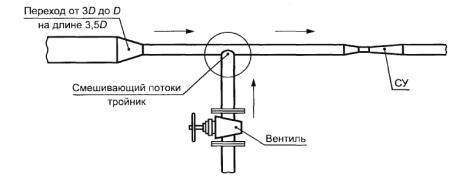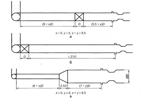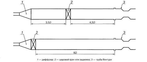 Рисунок 2 - Схема, расположения шарового крана или задвижки при р = 0,6 в) при наличии двух или более колен их следует рассматривать как одиночное МС (см. таблицу 3), если длина между последовательными коленами менее 15 D. 6.2.9 На рисунке 3 приведены два примера применения требований, указанных в перечислениях а) и б) 6.2.8. В каждом примере второе МС (см. рисунок 3) относительно трубы Вентури представляет собой МС вида «Два или более колен в одной или разных плоскостях», а относительный диаметр трубы Вентури равен 0,75. Длину прямолинейных участков ИТ определяют из условия недопустимости дополнительной неопределенности коэффициента истечения. Если первое МС - шаровой кран (см. рисунок 3а), то: - длина прямолинейного участка ИТ между трубой Вентури и краном должна быть не менее 5.5D (см. таблицу 3); - длина прямолинейного участка ИТ между МС вида «Два или более колен в одной или разных плоскостях» и краном должна быть не менее 9 D (см. пункт 2) перечисления а) 6.2.8); - расстояние между МС вида «Два или более колен в одной или разных плоскостях» и трубой Вентури должно быть не менее 22 D (см. перечисление б) 6.2.8). Таким образом, если шаровой кран имеет длину 1D, то требуется дополнительный участок длиной 6,5D = 22D - 1D - 9D-5.5D. Этот участок ИТ может быть расположен либо полностью до или после шарового крана, либо частично до и частично после него. Рекомендации перечисления а) 6.2.8 позволяют переместить шаровой кран к МС при условии, что расстояние между МС и трубой Вентури не менее 22D (см. рисунок 3 б). Если первое МС - переходник (диффузор) от 0.67D до D на длине 2,5D (см. рисунок 3в), то: - длина прямолинейного участка ИТ между диффузором и трубой Вентури должна быть не менее 7D (см. таблицу 3); - длина прямолинейного участка ИТ между МС вида «Два или более колен в одной или разных плоскостях» и диффузором должна быть, по крайней мере, 9∙0.67D ≈ 6D (см. пункт 2) перечисления а) 6.2.8); - расстояние между МС вида «Два или более колен в одной или разных плоскостях» и трубой Вентури должно быть, по крайней мере, 22D (см. перечисление б) 6.2.8). Таким образом, с учетом длины диффузора 2,5D требуется дополнительный участок ИТ длиной 6,5D = 22D-7 D-6D-2.5D, который может быть либо полностью до или после крана, либо частично до или частично после него.