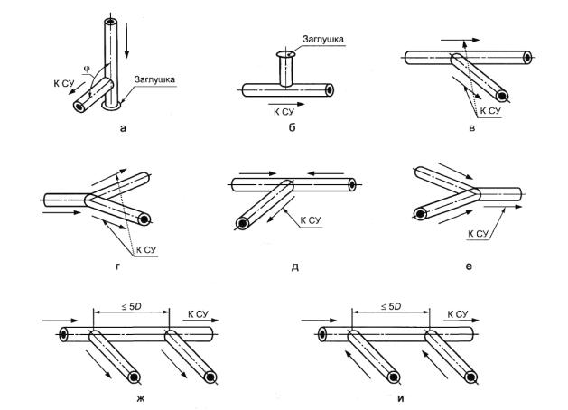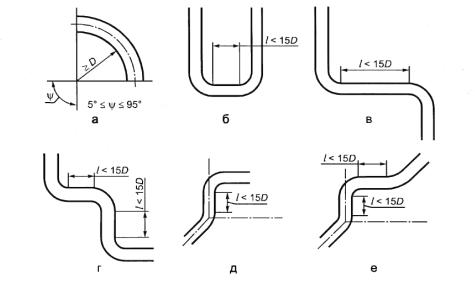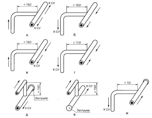 Рисунок 3 - Примеры определения необходимых длин прямолинейных участков ИТ (см. 6.2.9) 6.3 Струевыпрямители и устройства подготовки потокаДля уменьшения длины прямолинейных участков ИТ до трубы Вентури могут быть применены струевыпрямители или УПП. Допускается использовать только те виды струевыпрямителей или УПП, которые прошли испытания на соответствие требованиям ГОСТ 8.586.1 (приложение Ж). В любом случае испытания следует проводить с применением трубы Вентури. 6.4 Дополнительные требования к установке труб Вентури6.4.1 Округлость и цилиндричность трубы6.4.1.1 На участке ИТ длиной не менее 2D, расположенном непосредственно перед входной торцевой цилиндрической частью трубы Вентури, ни одно значение диаметра в любой плоскости на данном отрезке не должно отличаться от среднего значения внутреннего диаметра ИТ более чем на 2 %. 6.4.1.2 Среднее значение внутреннего диаметра ИТ, примыкающего к трубе Вентури, должно отличаться не более чем на 1 % значения среднего диаметра входного цилиндрического участка трубы Вентури (см. 5.2.2). 6.4.1.3 Внутренний диаметр ИТ, расположенный непосредственно за трубой Вентури, должен быть не менее 90 % диаметра на срезе ее диффузора. Это означает, что могут быть использованы трубопроводы с таким же диаметром отверстия, как и у выходного сечения диффузора трубы Вентури. 6.4.2 ШероховатостьОтносительная шероховатость ИТ на длине не менее 2D до трубы Вентури должна удовлетворять условию Ra/l D ≤ 3,2∙10-4. 6.4.3 Крепление трубы ВентуриСмещение оси ИТ перед трубой Вентури относительно оси трубы Вентури, измеренное в плоскости стыка трубопровода с цилиндрическим участком А трубы Вентури, должно быть не более 0,005 D. Взаимный перекос осей трубы Вентури и ИТ должен быть не более 1 %. Сумма указанного осевого смещения и половины отклонения диаметра (см. 6.4.1.2) ИТ от среднего значения диаметра цилиндрического участка А должна быть не более 0.0075 D. Приложение