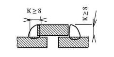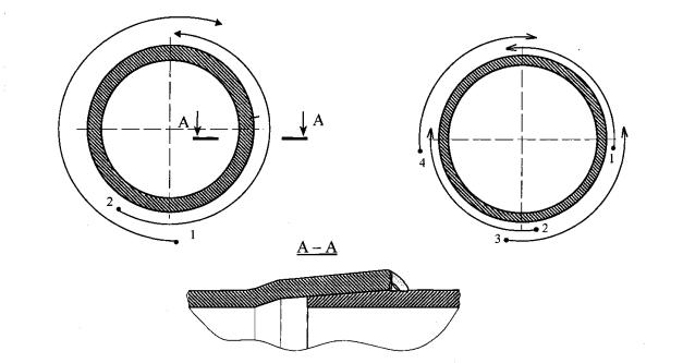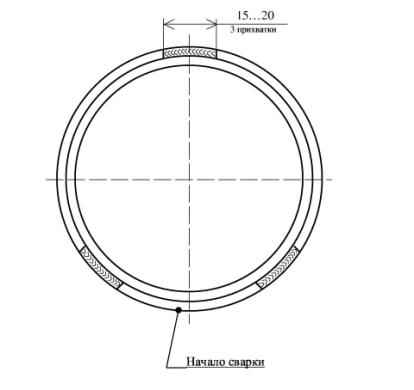 Рис. 4 Порядок выполнения прихваток при Ду свыше 100 мм. 6.9 Вертикальные неповоротные стыки свариваются в направлении «снизу-вверх». Наплавку слоя в потолочной части стыка следует начинать, отступая на 10.. .30 мм от нижней точки. 6.10 После окончания сварки для устранения структур отбела и закалки в ОШЗ необходимо провести отжиг стыка кольцевой газовой горелкой по режиму: нагрев до 920...950°С за 5...7 мин, выдержка при этой температуре 1...2 мин, замедленное охлаждение под слоем теплоизоляционного материала. Температуру подогрева необходимо контролировать оптическим пирометром типа «Кельвин-У» с диапазоном измеряемых температур от 50 до 1200°С и с точностью ± 5°С. 6.11 Все сварные соединения должны быть заклеймены сварщиками, выполнявшими сварку. Клеймо рекомендуется наносить несмываемой краской на расстоянии 30.. .40 мм от стыка. 7. Контроль качества сварки7.1 Сварные соединения труб из ВЧШГ должны подвергаться систематическому контролю, который должен состоять из предварительного, пооперационного и окончательного. 7.2 К предварительному контролю относятся: а) проверка квалификации сварщиков; б) контроль качества сварочного материала; в) проверка оборудования для сварки. 7.3 В пооперационный контроль должна входить проверка: а) точности сборки под сварку; б) чистоты основного и присадочного материала; в) качества и количества прихваток; г) соблюдения требований данной технологии и режимов сварки. 7.4 Контроль качества сварных соединений включает в себя: а) заварку контрольного стыка с последующей вырезкой и исследованиями макрошлифов; б) визуальный и измерительный контроль; в) гидроиспытания увеличенным давлением. 7.5. Заварка контрольного образца производится перед началом монтажа трубопровода в условиях полностью повторяющих монтажные, включая диаметр трубопровода, технику сварки и прочие особенности технологии. Заварка контрольного образца производится в неповоротном положении. Заварка контрольного образца производится при каждой смене условий монтажа трубопровода (например диаметр трубопровода), но не реже одного раза в месяц для каждого сварщика, задействованного в монтаже. Из контрольного образца производится вырезка и последующие исследования макрошлифов. Количество макрошлифов и правила контроля качества по макрошлифам изложены в разделе 3. настоящей Инструкции. Визуальному контролю подвергаются 100 % сварных соединений. Визуальный осмотр рекомендуется производить с применением лупы 3-10-кратного увеличения. Рис. 5 Порядок наложения слоев при сварке вертикального стыка труб: а) для труб диаметром до 219 мм; б) для труб диаметром более 219 мм. Сварные соединения признаются неудовлетворительными если будут выявлены следующие дефекты: а) трещины всех видов и направлений, расположенные в металле шва или околошовной зоне; б) несплавления, расположенные на поверхности сварного соединения; в) свищи, бугристость поверхности, не заваренные кратеры, прожоги; г) отклонения от величины катета, установленной в данной инструкции. 7.6 Контроль нахлёсточных и угловых сварных соединений рентгеновским и ультразвуковым контролем не производится. 7.7 Гидроиспытания сварных соединений осуществляются на давление 1,25 от рабочего. Гидроиспытания трубопровода считаются удовлетворительными, если после выдержки с испытательным давлением в течение 15 ми