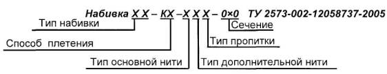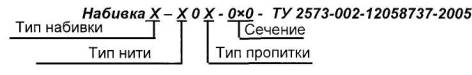 1.2 Типы, марки и обозначения набивок1.2.1 Обозначение однокомпонентной набивки в технической документации содержит буквенное обозначение типа набивки, цифровое обозначение типа нити, 0 (отсутствие дополнительной нити), цифровое обозначение типа пропитки, величину сечения набивки и обозначение настоящих технических условий: