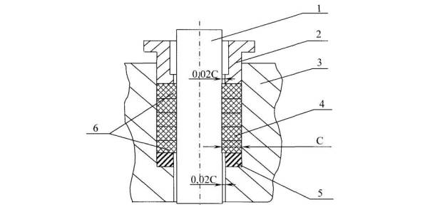 1 - шток (вал/защитная втулка), 2 - втулка нажимная, 3 - камера сальниковая, 4 - основные кольца сальникового пакета, 5 - кольцо подсальниковое, 6 - замыкающие кольца сальникового пакета Рисунок 1 6.2.5 Торец нажимной втулки и дно сальниковой камеры (торец подсальниковой втулки) должны быть выполнены под углом 90 ° по отношению к оси шпинделя и не должны иметь фасок. 6.2.6 Не допускается применение корродированного или поврежденного штока (шпинделя). 6.2.7 В случае отсутствия заходной конической фаски в сальниковой