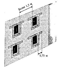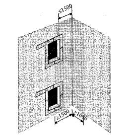 Схема 7.1 - Размещение теплоизоляционных плит в зоне внутреннего угла при наличии проемов - при расстоянии от внутреннего угла здания до ближайшего вертикального откоса сгонного проема более 1,5 м утепление наружных стен следует выполнять в соответствии со стандартным техническим решением; - при расстоянии между смежными проемами этажа, а также между углом здания и ближайшим проемом более 1,5 м промежуточные поэтажные рассечки из вышеуказанных негорючих минераловатных плит допускается выполнять в пределах этих участков, за исключением 1-го этажа зданий, дискретными, продлевая за пределы проема на расстояние не менее 0,75 м в сторону соответствующего бокового простенка (см. схему 7.2); - по всему контуру сопряжения рассматриваемой системы теплоизоляции с другой фасадной системой теплоизоляции (отделки, облицовки) должны устанавливаться рассечки из вышеуказанных негорючих минераловатных плит с высотой поперечного сечения не менее 0,15 м, на всю толщину сечения рассматриваемой системы (см. схему 7.2).