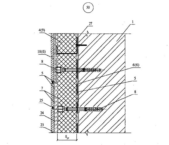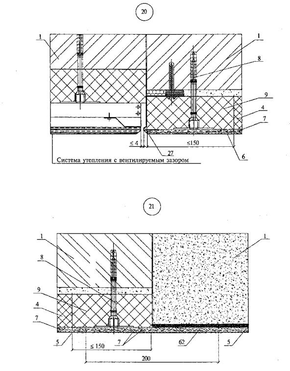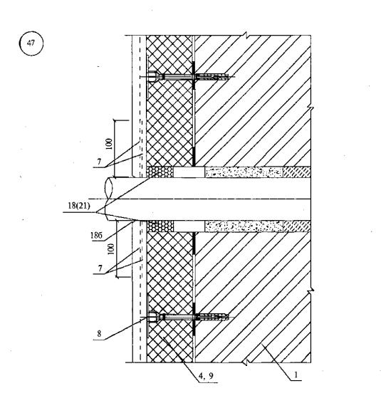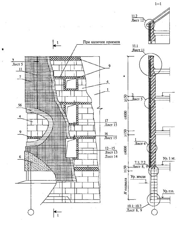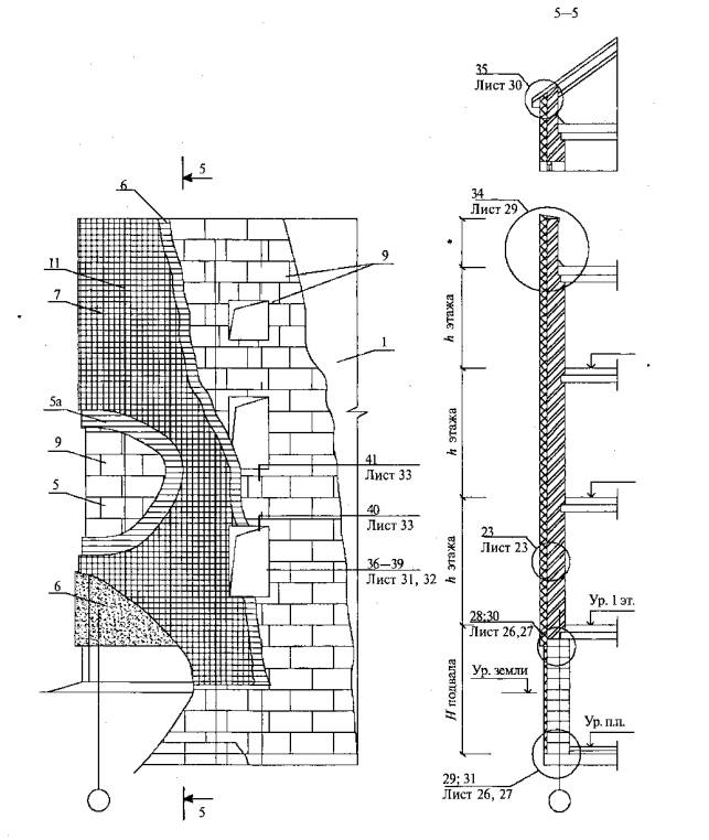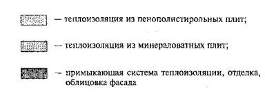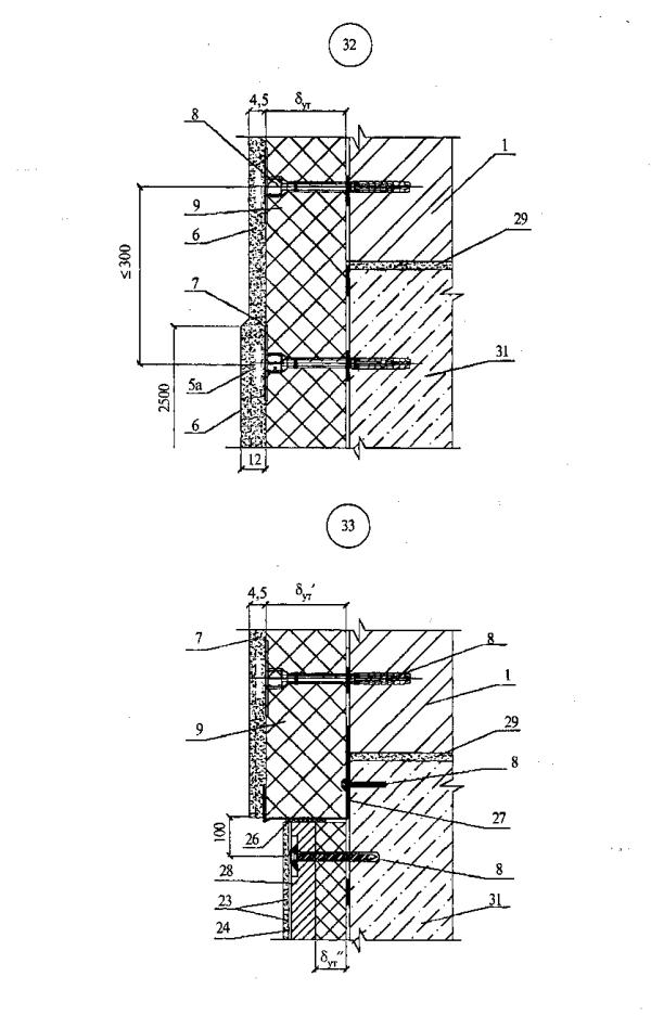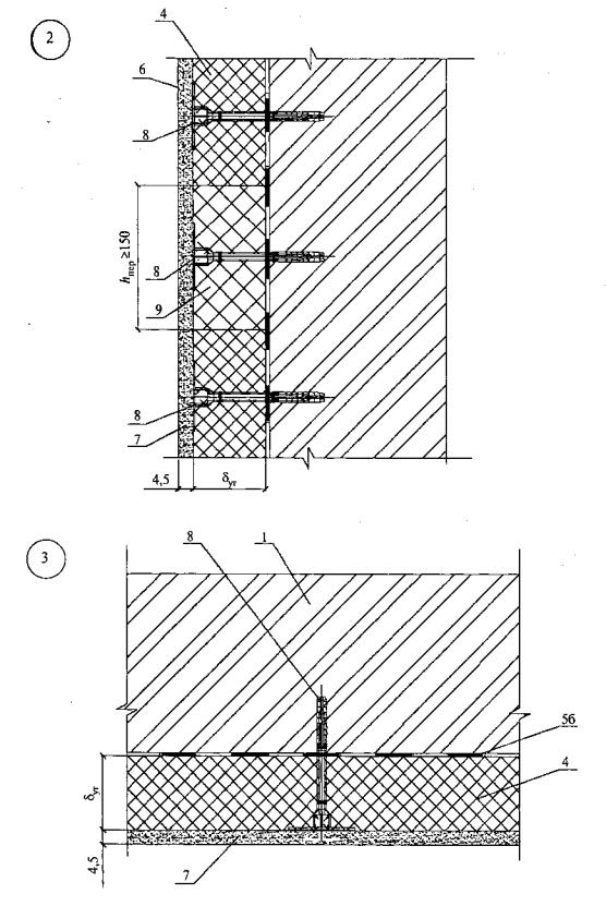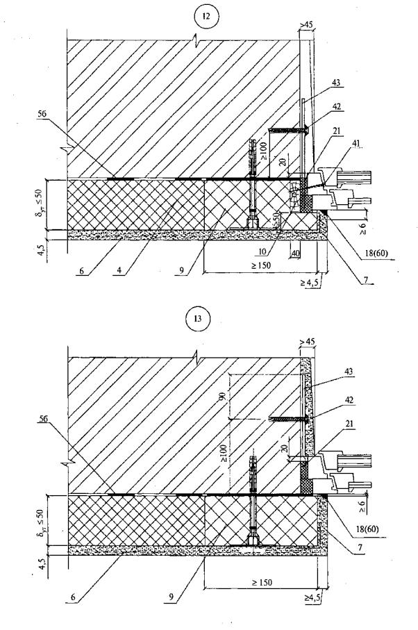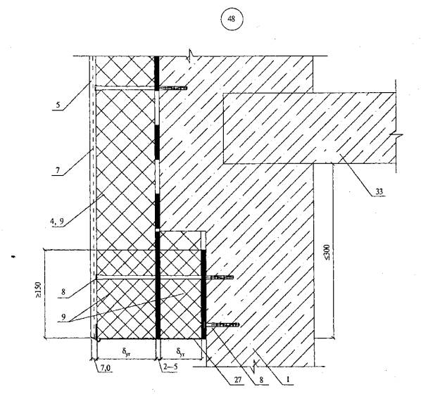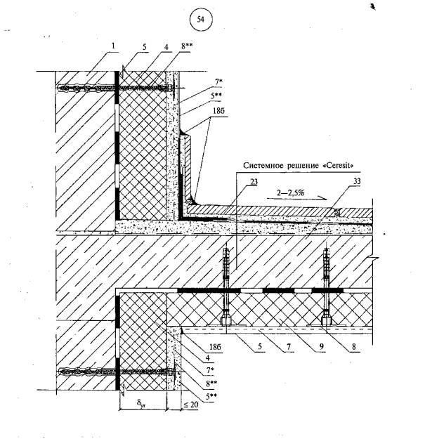 6 Конструктивные решения стен6.1 Стена при новом строительстве может быть несущая или самонесущая и представляет собой трехслойную конструкцию с несущим слоем из полнотелого глиняного кирпича толщиной 380 мм или 510 мм, а также из бетонных и ячеистобетонных блоков или монолитного железобетона со слоем теплоизоляции из плитного пенополистирола типа ПСБ-С или минераловатной плиты на синтетическом связующем с защитным слоем толщиной 4,5-9,0 мм из штукатурки «Ceresit CT190» (ТУ 5745-008-58239148) - для минплиты (система «Ceresit WM»), «Ceresit СТ85» (ТУ 5745-008-58239148) - для пенополистирола (система «Ceresit VWS»). При защитно-декоративном слое из штукатурки в соответствии с рекомендациями, изложенными в разделе 7, необходимо, чтобы: - защитная штукатурка имела нулевой предел распространения огня и была армирована щелочестойкой стеклосеткой; - толщина ее составляла 4,5 мм (кроме цоколя) и не менее 7 мм в цокольной части; - при теплоизоляции из пенополистирола предусматривались рассечки из негорючих материалов (в нашем случае - из минераловатных плит) на всю толщину слоя теплоизоляции и высотой не менее толщины перекрытия, но не менее 150 мм. 6.3 Системы наружной теплоизоляции с отделочным слоем из тонкослойной штукатурки «Ceresit» состоят из следующих основных элементов: - клеевая полимерцементная смесь для крепления теплоизоляционных плит к стене; - теплоизоляционные плиты для создания теплоизоляционного слоя; - тарельчатые дюбели и анкеры; - клеевая полимерцементная смесь для устройства базового армированного слоя; - сетка стеклянная строительная, пропитанная щелочестойким составом для армирования базового слоя; - декоративные тонкослойные штукатурки для устройства защитно-декоративного покрытия. 6.4 Для устройства систем «Ceresit» также предусмотрено использование следующих материалов и изделий: - грунтовки для укрепления и импрегнирования оснований; - опорные/цокольные профили, выравнивающие прокладочные шайбы и соединительные элементы для защиты торцов граничного ряда теплоизоляционного материала, а также для устройства различных примыканий систем утепления; - угловые и примыкающие профили; - герметики, пеногерметики и уплотнительные материалы; - фасадные краски. 6.5 Общая характеристика слоев и используемых компонентов приведена в таблице 6.1. Таблица 6.1