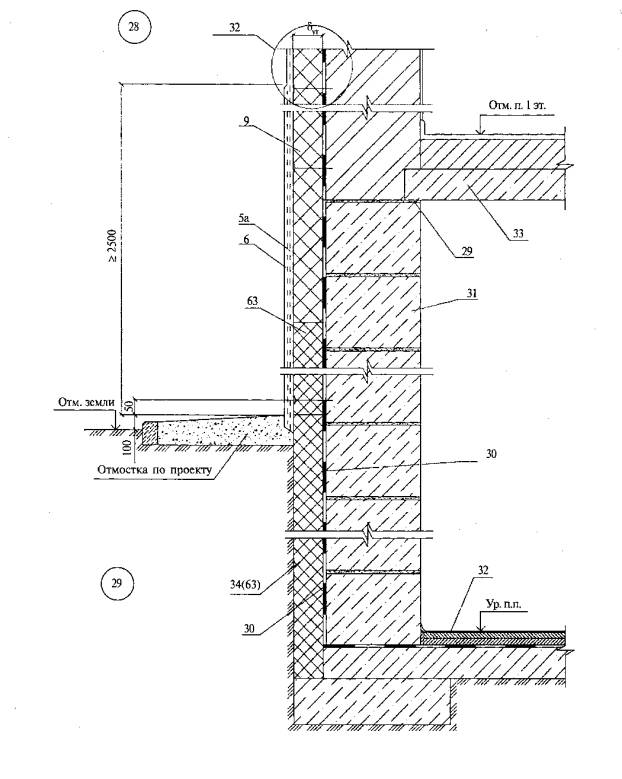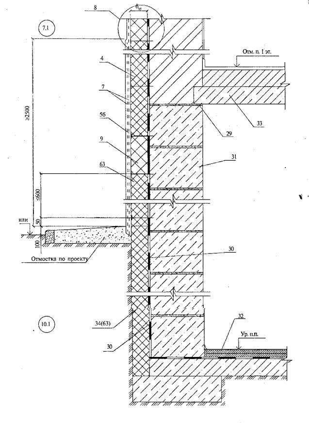 Схема 7.3 - Размещение теплоизоляционных плит на «глухих» стенах здания - при наличии в здании участков с разновысокой кровлей последняя должна выполняться по всему контуру сопряжения с примыкающей к ней сверху системой теплоизоляции, в том числе «глухих» (без проемов) участков фасада в соответствии с п. 2.11 СНиП II-26-76 «Кровли» (как «эксплуатируемая»), на расстояние не менее 2 м от границы их сопряжения, в случае примыкания системы теплоизоляции к неэксплуатируемой кровле (участку кровли) в качестве в системе на высоту не менее 3,5 м от границы их сопряжения должны исполъзоваться вышеуказанные негорючие минераловатные плиты; - теплоизоляцию парапетов зданий со стороны кровли следует выполнять с применением вышеуказанных негорючих минераловатных плит; допускается выполнять теплоизоляцию парапетов со стороны кровли с применением вышеуказанных пенополистирольных плит в случаях, если примыкающая к парапету кровля выполнена в соответствии с п. 2.11 СНиП II-26-76 «Кровли» (как «эксплуатируемая»), на расстояние не менее 2 м от границы их сопряжения; - теплоизоляцию перекрытий здания следует, как правило, выполнять с применением вышеуказанных негорючих минераловатных плит; допускается применение вышеуказанных пенополистирольных плит в случаях, если расстояние от уровня отмостки здания до утепляемого перекрытия составляет не менее 6 м и при наличии нижерасположенного проема расстояние от верхнего откоса до утепляемого перекрытия составляет не менее 3,5 м; - участки стен в пределах всей высоты проекции пожарной лестницы, наружной маршевой лестницы и не менее 0,5 м в каждую боковую сторону, считая от соответствующего края лестницы, должны выполняться с применением в качестве утеплителя вышеуказанных негорючих минераловатных плит. 7.4 Вышеуказанные класс пожарной опасности и область применения рассматриваемых конструкций действительны для зданий: - соответствующих требованиям пп. 4.2, 4.4 и 5.3 ГОСТ 31251-2003 «Конструкции строительные. Методы определения пожарной опасности. Стены наружные с внешней стороны»; - соответствующих требованиям действующих СНиПов в части обеспечения безопасности людей при пожаре; - высотность (этажность) которых не превышает установленную действующими СНиПами. 7.5 Наибольшая высота применения вышеуказанной системы для зданий различного функционального назначения в зависимости от ее класса пожарной опасности (КО) приведена в таблице 4.1. Решение о возможности применения с позиций обеспечения пожарной безопасности рассматриваемой фасадной системы теплоизоляции на зданиях, не отвечающих требованиям п. 7.4 настоящего раздела, и для зданий сложной архитектурной формы (наличие выступающих/западающих участков фасада, смежных с проемами внутренних углов здания, архитектурных элементов отделки фасадов и др.) принимается в установленном порядке, в соответствии с п. 1.6 СНиП 21-01-97 при представлении прошедшего экспертизу в ЛПИСИЭС ЦНИИСК им. В.А. Кучеренко проекта привязки системы к конкретному объекту. 7.6 Отступления от представленных в Материалах для проектирования технических решений фасадной системы «Ceresit VWS», возможность замены предусмотренных системных материалов и изделий на другие (за исключением уже оговоренной в пп. 7.1 и 7.2 согласовываются в установленном порядке. 7.7 Площадь пенополистирола, не защищенного шту
