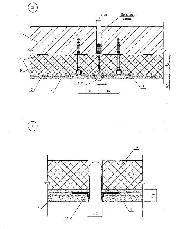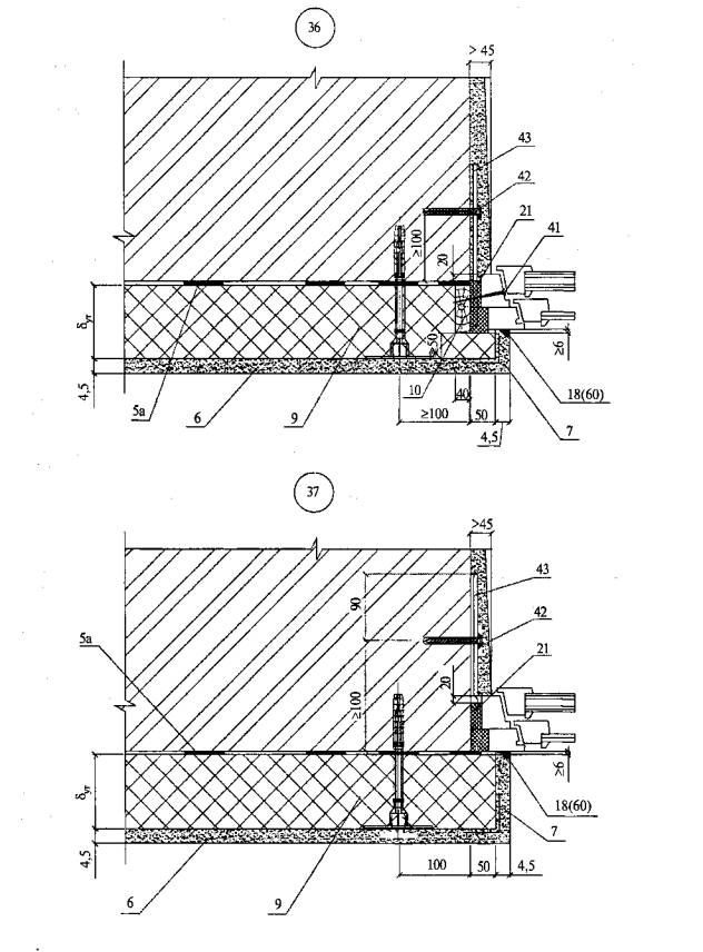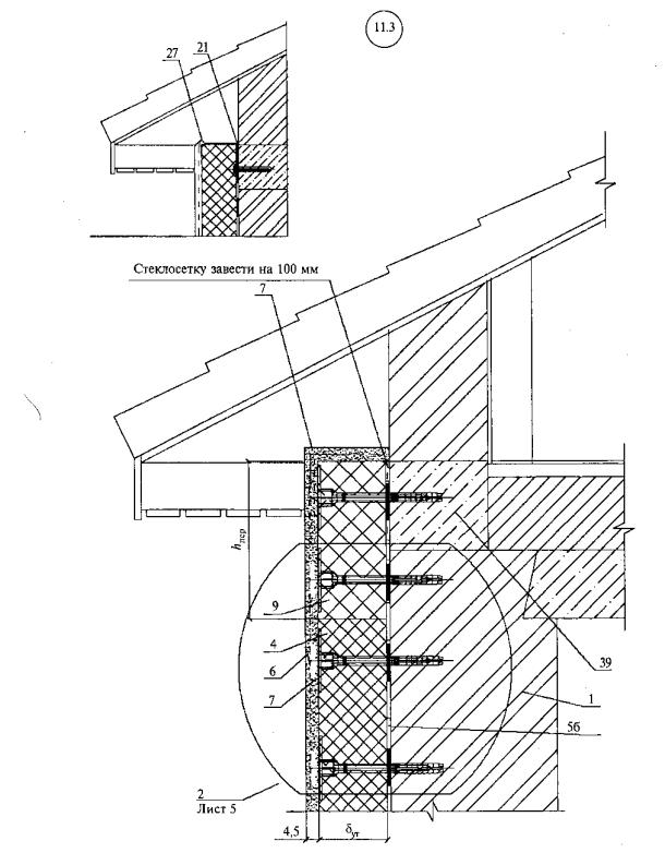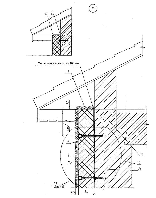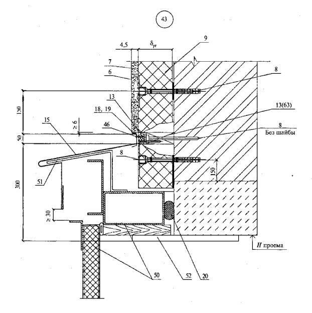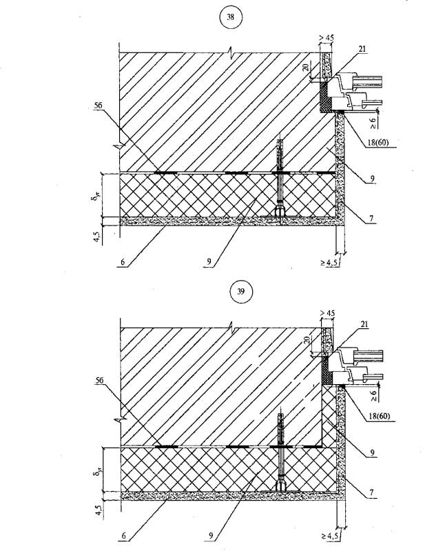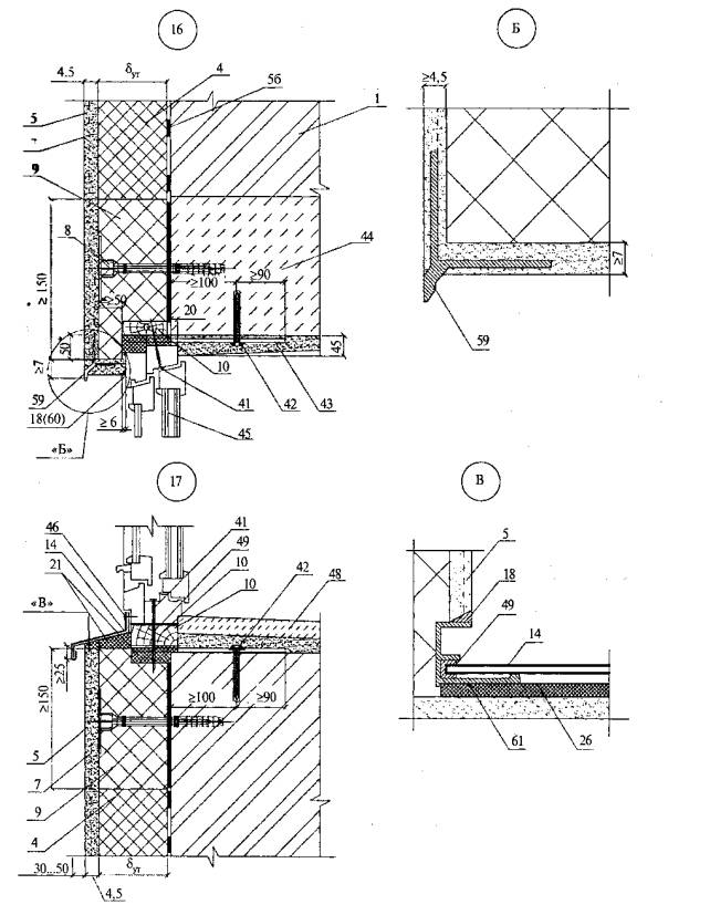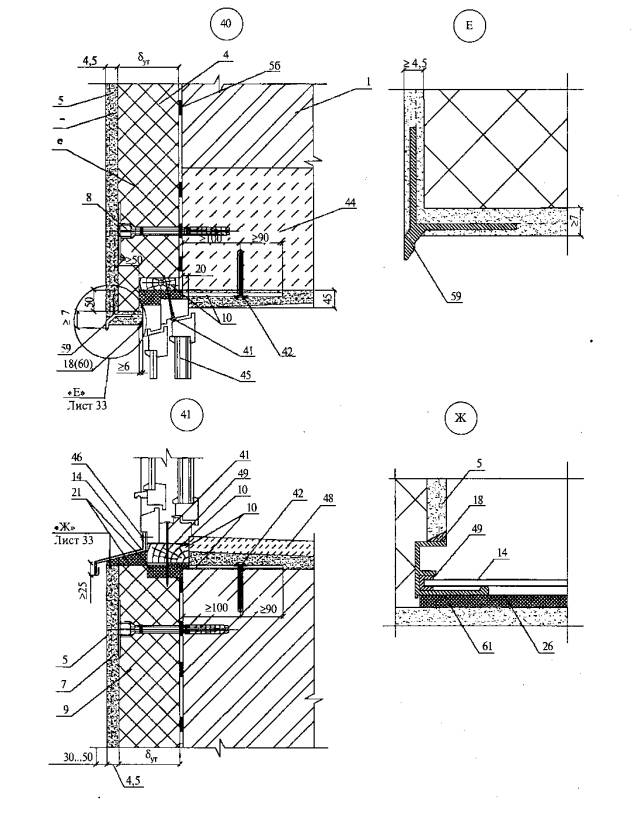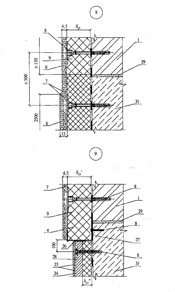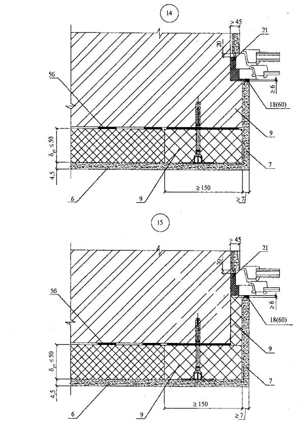 6.18 Внешние углы здания с укрепленной теплоизоляцией, а также углы дверных и оконных проемов должны быть усилены пластмассовыми уголками с вклеенной сеткой, которые устанавливают встык по отношению друг к другу с нахлесткой сетки в месте стыка на 10 см. 6.19 После устройства усиливающего уголка на плоскости откосов дверных и оконных проемов следует наклеить усилительную диагональную армирующую сетку размером 20×30 см. При этом усилительная сетка в углах оконных и дверных проемов вклеивается без напуска на пластмассовую часть уголка. 6.20 При устройстве защитного слоя на поверхность закрепленного утеплителя наносится полутерком клеевой состав «Ceresit CT85» по пенополистирольному утеплителю с противопожарными рассечками из минплиты в системе «Ceresit VWS» или «Ceresit CT90» - по минераловатному утеплителю в системе «Ceresit WM», на котором фиксируется и втапливается полотно стеклосетки. Второе и последующие полотна стеклосетки устанавливают с напуском не менее 10 см на предыдущее. 6.21 После технологического перерыва не менее 72 ч, необходимого для высыхания клеевого состава, на поверхность защитного слоя наносят грунтовку «Ceresit CT16» или производят окраску с подготовкой. 6.22 До нанесения защитно-декоративного слоя необходимо выдержать технологический перерыв не менее 6 ч. 6.23 Основание под декоративную штукатурку или окраску должно соответствовать требованиям СНиП 3.04.01-87. 6.24 На заармированную щелочестойкой армирующей сеткой поверхность защитной штукатурки декоративная штукатурная смесь наносится теркой слоем, соответствующим размеру зерна минерального наполнителя. 6.25 Работы по нанесению декоративной штукатурной смеси следует выполнять при температуре воздуха от +5 до +30°С (для цветных штукатурок - от +9°С) и относительной влажности не более 80 %. 6.26 При выполнении работ следует избегать нанесения штукатурки на участки фасада, находящиеся под воздействием прямых солнечных лучей, ветра и дождя, для чего строительные леса следует закрывать ветрозащитной сеткой или пленкой. 6.27 Свеженанесенный декоративный штукатурный слой в течение суток для штукатурок белой и «под окраску» и трех суток для цветной штукатурки следует защищать от прямого воздействия дождя и пересыхания под воздействием прямых солнечных лучей. 6.28 Окрашивание штукатурки следует выполнять силикатными фасадными красками (например, «Ceresit CT54») через 3 дня, а акриловыми (например, «Ceresit CT42» или «Ceresit CT44») - через 7 сут после устройства штукатурки. 6.29 Между штукатурным слоем и элементами заполнения проемов (окон, дверей) применяется профиль из ПВХ с уплотнительной лентой. Как вариант, предусматривается паз на всю толщину штукатурки, заполняемый уплотнительной лентой, герметиком, вулканизирующимися мастиками и т.п. 6.30 На высоту не менее 2,5 м от планировочной отметки и на участках фасада с предусмотренной плиточной облицовкой защитный слой должен выполняться толщиной не менее 7 мм с устройством дополнительного слоя стеклосетки, причем для первого слоя рекомендуется использование усиленной, так называемой панцирной, стеклосетки плотностью не менее 250 г/м3, дополнительно закрепленной фасадными дюбелями в количестве не менее 2 шт./м2. Облицовка утепляемого фасада плиткой на высоту более 5 м допускается при согласовании с местными органами пожарной охраны, исходя из региональных требован