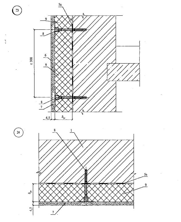 6.6 Теплоизоляционные плиты крепят к несущему слою стены на клею и дополнительно распорными дюбелями. При подготовке поверхности стены (основания) до закрепления к ней теплоизоляции рекомендуется использовать при необходимости: антигрибковый препарат «Ceresit CT99»; смывки для удаления высолов; грунтовки «Ceresit CT16» и «Ceresit CT17» (ТУ 5745-008-58239148), выравнивающую штукатурку и ремонтную шпатлевку «Ceresit CT29» (ТУ 5745-007-58239148). В сплошном теплоизоляционном слое предусматриваются температурные деформационные швы по осевым отметкам существующих деформационных швов здания и с интервалом 24 м (в слое минераловатного утеплителя) или 36 м (в слое пенополистирольного утеплителя). 6.7 Для наклейки минераловатных плит рекомендуется использовать клей «Ceresit CT190», а пенополистирольных плит - «Ceresit CT83» или «Ceresit CT85» (ТУ 5745-008-58239148), которые характеризуются прочностью сцепления с основанием не менее 0,6 МПа, морозостойкостью не менее 75 циклов и величиной линейной усадки не более 0,5 %. 6.8 Клей следует наносить на теплоизоляционную плиту с помощью штукатурного шпателя валиком (шириной 4-6 см) по всему периметру с отступлением от краев на 2-3 см и дополнительно «куличами» на остальную поверхность плиты, при этом площадь приклеенной поверхности плит - не менее 40 %. 6.9 Установку плит в проектное положение осуществляют с прижатием к поверхности несущей части стены и выравниванием по высоте относительно друг друга трамбовками. Образование излишков выступающего клея недопустимо. 6.10 Выравнивание по горизонтали теплоизоляционных плит может осуществляться с помощью временно закрепленной к несущей части стены деревянной рейки или с применением цокольного профиля (изготовленного из алюминия или оцинкованной стали) толщиной 1 - 1,5 мм, который закрепляют к несущей части стены дюбелями, расположенными с шагом не более 300 мм. 6.11 При установке цокольных профилей необходимо оставлять зазор в стыке между ними 2 - 3 мм. Для выравнивания вдоль несущей части стены необходимо использовать соответствующие подкладочные шайбы из ПВХ, а для соединения профилей между собой - пластмассовые соединительные элементы. 6.12 После установки первого ряда теплоизоляционных плит на цокольный профиль зазор между поверхностью несущей части стены и профилем необходимо заполнить полиуретановой пеной. 6.13 Теплоизоляционные плиты устанавливают вплотную друг к другу. В случае если между ними образуются зазоры более 2 мм, их необходимо заполнить материалом используемого утеплителя или полиуретановой пеной. 6.14 Установку и наклеивание теплоизоляционных плит следует выполнять с перевязкой швов и устройством зубчатого защемления на внешних и внутренних углах стен. 6.15 Плиты теплоизоляционного материала, устанавливаемые в углах оконных и дверных проемов, должны быть цельными с вырезанными по месту фрагментами. Не допускается стыковать плиты на линиях углов оконных и дверных проемов. 6.16 Сверление отверстий и выборочную установку (над проемами, в угловых зонах) пластиковых дюбелей без распорного сердечника допускается производить в ходе монтажа плит утеплителя. Установка в рабочее положение дюбелей для крепления плит утеплителя должна выполняться после полного высыхания клеевого состава. Срок высыхания при температуре наружного воздуха 20 °С и относительной влажности 60 % составляет не менее 72 ч. Перед ус