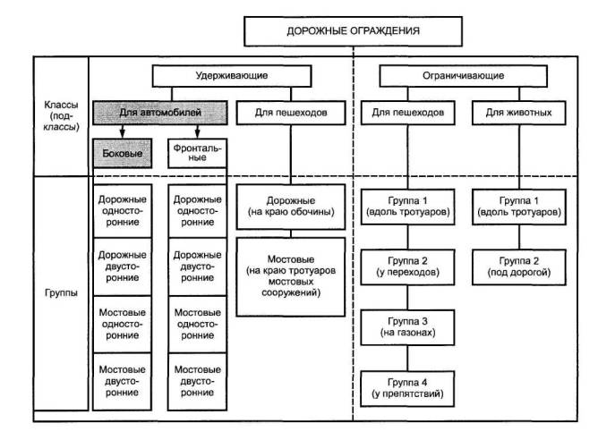 ГОСТ Р 52606-2006 НАЦИОНАЛЬНЫЙ СТАНДАРТ РОССИЙСКОЙ ФЕДЕРАЦИИТехнические средства организации дорожного движенияКЛАССИФИКАЦИЯ ДОРОЖНЫХ ОГРАЖДЕНИЙ Traffic control devices. Дата введения - 2008-01-01 1 Область примененияНастоящий стандарт устанавливает классификационные признаки для разделения конструкций дорожных ограждений на классы, группы, типы и виды. Настоящий стандарт предназначен для использования при разработке нормативных и методических документов в области безопасности дорожного движения с целью обеспечения единого понимания определений, названий и характеристик устройств, относящихся к техническим средствам организации дорожного движения. 2 Нормативные ссылкиГОСТ Р 52289-2004 Технические средства организации дорожного движения. Правила применения дорожных знаков, разметки, светофоров, дорожных ограждений и направляющих устройств ГОСТ 26804-86 Ограждения дорожные металлические барьерного типа. Технические условия Примечание - При пользовании настоящим стандартом целесообразно проверить действие ссылочных стандартов в информационной системе общего пользования - на официальном сайте Федерального агентства по техническому регулированию и метрологии в сети Интернет или по ежегодно издаваемому информационному указателю «Национальные стандарты», который опубликован по состоянию на 1 января текущего года, и по соответствующим ежемесячно издаваемым информационным указателям, опубликованным в текущем году. Если ссылочный стандарт заменен (изменен), то при пользовании настоящим стандартом следует руководствоваться замененным (измененным) стандартом. Если ссылочный стандарт отменен без замены, то положение, в котором дана ссылка на него, применяется в части, не затрагивающей эту ссылку. 3 Термины и определенияВ настоящем стандарте применены следующие термины с соответствующими определениями: 3.1 дорожные ограждения: Устройства, относящиеся к техническим средствам организации дорожного движения в соответствии с ГОСТ Р 52289. 3.2 дорожные удерживающие ограждения: Устройства по 3.1, предназначенные для предотвращения съезда транспортного средства с земляного полотна дороги и мостового сооружения (моста, путепровода, эстакады и т. п.), переезда через разделительную полосу, столкновения со встречным транспортным средством, наезда на массивные препятствия и сооружения, расположенные на разделительной полосе, обочине и в полосе отвода дороги (удерживание автомобиля), а также устройства, предназначенные для предотвращения падения пешеходов с мостового сооружения и земляного полотна дороги (удерживание пешехода). Примечание - Расположение дорожных удерживающих ограждений приведено на рисунке 1.