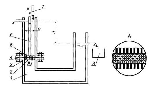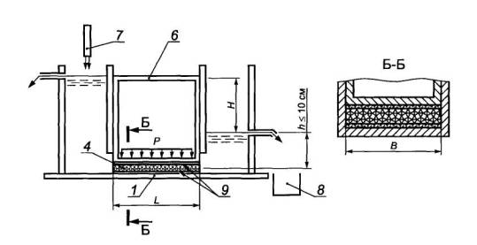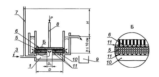б - в плоскости полотна 1 - фильтрационная камера внутренним диаметром D; 2 - перфорированный диск; 3 - устройство для подачи воды; 4 - сетка; 5 - проба геотекстильного материала; 6 - перфорированный штамп; 7 - пьезометрическая трубка; 8 - устройство для передачи давления (Р) на пробу; 9 - емкость для сбора и измерения объема воды; 10 - диск с отверстием диаметром D1 для подачи воды; 11 - резиновые прокладки; Н - значение напора; h - уровень воды на выходе из прибора Рисунок 2 - Примеры схемы прибора со сменной фильтрационной камерой для определения водопроницаемости геотекстильных материалов в разных направлениях 4.3.5 Приборы для определения водопроницаемости должны отвечать следующим общим требованиям: - обеспечивать создание давлений на пробу и напоров (градиентов напоров), указанных в 4.2.1, 4.2.2; - поддерживать постоянный напор в течение испытания, причем проба должна быть всегда в водонасыщенном состоянии (должен сохраняться уровень воды на входе и выходе воды из пробы); - обеспечивать герметичность поверхностей их элементов, контактирующих с пробой; - обеспечивать неизменность положения образца в процессе испытаний; - влияние расположенных на пути фильтрационного потока элементов приборов не должно приводить к изменению коэффициента фильтрации более чем на 3 %; - соприкасающиеся с водой элементы приборов следует изготовлять из коррозионно-стойкого материала. В зависимости от схемы приборы должны отвечать также требованиям, приведенным в 4.7.1, 4.8.1. 4.4 Подготовка к испытаниям4.4.1 Для отобранных по 4.2.6, 4.2.7 проб оценивают значение толщины по ГОСТ Р 50276 и поверхностной плотности по ГОСТ Р 50277. 4.4.2 В воду, предназначенную для определения коэффициента фильтрации, вводят снижающие гидрофобный эффект добавки, помещают пробы геотекстильного материала, слегка помешивают воду для удаления пузырьков воздуха и выдерживают до выравнивания ее температуры с температурой воздуха, но не менее 3 ч. 4.4.3 Выполняют сборку прибора с установкой образца в порядке, зависящем от схемы прибора (см. 4.7, 4.8). 4.4.4 В фильтрационную камеру (трубку) прибора подают воду с напором, соответствующим максимальному из применяемых в испытаниях, выполняют несколько циклов разгружения - нагружения образца давлением 2 кПа, выдерживают образец в фильтрационной камере (трубке) без давления при продолжающейся подаче воды в течение не менее 10 мин и повторно выполняют несколько аналогичных циклов разгружения - нагружения. 4.5 Проведение испытаний4.5.1 В фильтрационную трубку подают воду до максимально возможного уровня и несколько раз приподнимают штамп для удаления пузырьков воздуха, затем создают требуемое давление на пробу и задают значение напора (градиента напора). 4.5.2 Поддерживают заданный напор (градиент напора) воды и измеряют время, в течение которого заполняется мерный цилиндр с рекомендуемой вместимостью 1000 см3. Эту операцию выполняют не менее пяти раз. Если результаты измерений времени отличаются более чем на 10 %, число измерений увеличивают. За окончательный результат принимают среднее из пяти последних измерений значений времени, отличающихся не более чем на 5 %. Время заполнения мерного цилиндра должно быть не менее 15 с. Если это условие не соблюдается, следует увеличить вместимость мерного цилиндра. Измеряют температуру воды. 4.5.3 Повторяют испытания по 4.5.2 для каждого из назначе