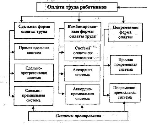 Рис. 2. Формы и системы оплаты труда работников сельхозорганизаций. При простой повременной форме оплат груда производится в зависимости от отработанного времени по часовым, дневным и месячным ставкам или окладам. Применяется в тех случаях, когда выработка отдельного работника не может быть точно учтена и выражена в определенном количестве продукции или работы или когда по характеру работы экономически нецелесообразно переводить работников на сдельную оплату труда. Повременно - премиальная система оплаты труда, при которой, кроме заработка по тарифу за отработанное время, работникам дополнительно выплачивается премия за выполнение и перевыполнение определенных показателей (например, своевременное и качественное выполнение работ, своевременное выполнение месячного задания). Применение повременно-премиальной системы дает хорошие результаты на вспомогательных работах (оплата труда подсобных работников, работников ремонтно-механических мастерских, электромонтеров и т.д.). Она, как правило, лишь дополняет аккордно-премиальную и сдельно-премиальную системы. Применяют её для оплаты труда руководящих работников и специалистов, служащих и обслуживающего персонала организации. Непосредственно на основных производственных работах по этой системе оплачивают труд, слабо поддающийся нормированию, на работах, непосредственно не связанных с производственными процессами. Например, в полеводстве повременно оплачиваются рабочие нефтескладов, заправщики топлива, сторожа токов и полевых станов, рабочие машинного двора, кладовщики и т.п. В животноводстве - ветсанитары, и рабочие ветлечебниц, мотористы водокачек, ночные сторожа, сезонные рабочие в овцеводстве на период стрижки и окотов. Эта оплата труда эффективна при строгом и качественном контроле за фактически отработанным временем, правильном присвоении работникам тарифных разрядов, применении научно-обоснованных норм обслуживания и нормативов численности повременщиков, правильном выборе факторов для премирования и точном учете фактических результатов работы по установленным показателям. При повременно-премиальной системе оплаты с доплатой за продукцию начисление оплаты до получения продукции производится за отработанное время, а после окончательного определения объема производства продукции начисляется доплата за продукцию и премии в зависимости от выполнения плана в установленном размере. На основных производственных работах в организациях повременная и повременно-премиальная система применяется редко а, как правило, дополняет сдельно-премиальную и аккордно-премиальную формы оплаты труда. Так, в полеводстве повременно оплачивается труд рабочих нефтескладов, топливозаправщиков, в животноводстве - ветсанитаров, ночных сторожей, сезонных рабочих в овцеводстве на период окота и стрижки и т.д. Эта форма оплаты применяется на выращивании неплодоносящих многолетних насаждений, по уходу за рабочим скотом и производителями. Сдельная форма - это оплаты труда, по которой труд оплачивается по количеству произведенной продукции (работы) установленного качества с учетом сложности и условий труда. По принятому порядку учета труда эта форма может быть индивидуальной когда учитывается результат труда каждого исполнителя в отдельности или коллективной (группо
