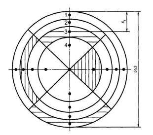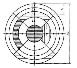 Минимальное число точек отбора проб для круглых и прямоугольных газоходов приведено в таблицах 1 и 2 соответственно. Точки отбора проб должны быть расположены в центрах равных площадей в плоскости отбора проб в соответствии с приложением В.
