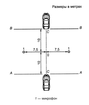 Рисунок 2 - Местоположения микрофонов 7.2. Число измерений С каждой стороны автомобиля должно быть выполнено не менее двух измерений. 7.3. Снятие показаний Регистрируют максимальный уровень звука при каждом прохождении автомобилем отрезка между линиями АА и ВВ (рисунок 2). Если пиковое значение шума явно превосходит общий наблюдаемый уровень, то такие показания исключают как анормальные. Результаты признают действительными, если разность между двумя последовательными измерениями с той стороны автомобиля, где шум наибольший, не превосходит 2 дБА За результат испытаний по каждому из способов принимают наибольшее значение уровня звука. 7.4. Требования к испытуемому автомобилю Автомобиль должен быть без нагрузки (кроме водителя) и без прицепа или полуприцепа, кроме случая, когда они не могут быть отделены. Шины автомобиля должны быть обычного типа и накачаны до давления, рекомендованного изготовителем для ненагруженного автомобиля. До начала измерений двигатель должен быть отрегулирован в соответствии с требованиями изготовителя и прогрет до нормальной рабочей температуры. Топливо, свечи зажигания, карбюратор(ы) и т.д. должны соответствовать рекомендованным изготовителем. 7.5. Рабочий режим 7.5.1. Общие условия Автомобиль должен приблизиться к линии АА так, чтобы его продольная ось как можно точнее совпадала с линией СС, как указано в 7.5.2.1-7.5.2.3. При испытаниях при разгоне в момент, когда передняя часть автомобиля пересечет линию АА, педаль подачи топлива с максимально возможной быстротой нажимают до упора, но так, чтобы обеспечить разгон без преднамеренного понижения передачи [например, без включения передачи для быстрого разгона (без кикдауна, если этот режим имеется у автоматической коробки передач)], и удерживают в таком положении, пока задняя часть автомобиля не пересечет линию ВВ. В этот момент педаль резко полностью отпускают. При испытаниях с постоянной скоростью движения педаль подачи топлива устанавливают в такое положение, чтобы на участке между линиями АА и ВВ выдерживалась постоянная скорость, указанная в 7.5.2. Если автомобиль имеет более двух ведущих колес, то его испытывают при включенном приводе, соответствующем обычному применению. Если автомобиль имеет дополнительный управляемый вручную узел трансмиссии (например, раздаточную коробку) или демультипликатор, то они должны быть включены как для обычного движения в городе. В любом случае при испытаниях не используют передачу, включаемую для маневрирования, при парковке или торможении. 7.5.2. Специальные условия 7.5.2.1. Автомобили с ручным переключением передач При испытаниях с постоянной скоростью и при разгоне автомобиль должен пересечь линию АА на второй передаче с постоянной скоростью VAA, км/ч, рассчитываемой по формуле