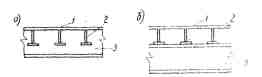 Рис 1. Типы ортотропной проезжей части: а - одноярусная; б - двухъярусная; 1 - покрывающий лист; 2 - продольное ребро; 3 - поперечная балка 7. Двухъярусное расположение продольных ребер и поперечных балок (рис. 1, б) менее выгодно (увеличивается расход металла) по сравнению с одноярусным, но более эффективно при изготовлении и монтажу конструкций. 8. Конструкцию плиты из сравнительно легких и жестких панелей (щитов), окаймленных уголками или другими элементами и опирающихся на пояса главных балок и узлы ферм поперечных связей, рекомендуется применять лишь в сборно-разборных мостах и при строительстве в труднодоступных районах. 9. Рекомендуемые расстояния между продольными ребрами ортотропной плиты проезжей части - 300÷350 мм; между поперечными балками - 1,8÷2,5 м (при продольных ребрах открытого профиля) и 2,5÷4 м (при продольных ребрах коробчатого, жесткого на кручение поперечного сечения). 10. Для эффективного использования автоматической сварки разрешается отступать от оптимальных расстояний между поперечными балками, если это экономически оправдано. При этом следует учитывать, что увеличение расстояния между поперечными балками вдвое, против оптимального, утяжеляет плиту примерно на 6%. 11. Минимальная толщина покрывающего листа назначается из условий трещиностойкости защитнозадавого покрытия по графику (рис. 2.)