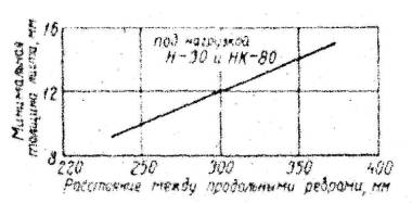 Рис. 2. Зависимость толщины листа от расстояния между продольными ребрами. 12. Наилучшим профилем продольного ребра являются холодно-штампованные (гнутые) из тонкого листа (толщиной 5÷6 мм) коробчатые ребра, жесткие на кручение. Они могут быть трапецеидальными, U - образными и V - образными (рис. 3). наиболее употребительны трапецеидальные.