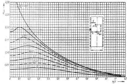 Рис. 5. Поверхности влияния изгибающего момента mxm в ортотропной плите, свободно опертой по двум сторонам: Вх=Ву; μ=0; х=0,3