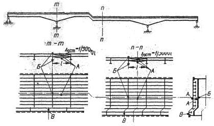 Рис. 7. опасные места (точки А, Б, В) ортотропной плиты проезжей части неразрезного пролётного строения. 49. В нижних фабрах у середин пролетов поперечных балок (в точках б) предельное состояние по прочности наступает в результате незначительного развитая пластических деформаций (Ru = 1,05 R0, где 1,05 - коэффициент, учитывающий возможность некоторого развитая пластических деформаций нагиба в предельном состоянии). Прочность необходимо проверять по формуле δу.м + δу.с ≤Ru Ширина листа, работавшего совместно c поперечной балкой, принимается при проверке прочности равной 0,2 пролета поперечной балки. 50. Формула проверки прочности горизонтального ласта (точка А, б, В в зонах как растягивающих, так и сжимающих продольных усилий от совместной работы с главными балками) имеет вид