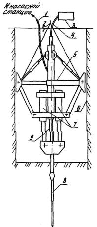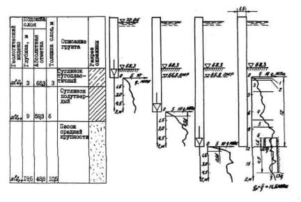 2. ОСОБЕННОСТИ ПОЭТАПНОГО СТАТИЧЕСКОГО ЗОНДИРОВАНИЯ ОСНОВАНИЯ С ПОВЕРХНОСТИ ГРУНТА2.1. Поэтапное статическое зондирование с поверхности грунта может быть применено для испытания грунтов на больших глубинах (более 20 м), а также при наличии в основании фундамента прослоек грунта, исключающего техническую возможность статического зондирования. 2.2. Поэтапное зондирование с поверхности грунта выполняют в следующей очередности: зонд погружают с поверхности грунта до максимально возможной глубины, ограниченной максимальным усилием вдавливания установки, либо предельно допускаемым сопротивлением грунта под конусом зонда или по его боковой поверхности; зонд извлекают на поверхность; разбуриванием прозондированного грунта ударно-канатным или колонковым способом разрабатывают скважину диаметром 89-127 мм; зонд опускают на забой и проводят зондирование грунта до глубины, ограниченной указанными выше критериями; зонд извлекают и повторяют очередной этап зондирования до тех пор, пока не будет достигнута требуемая глубина. 3. ОСОБЕННОСТИ ПОЭТАПНОГО ЗОНДИРОВАНИЯ ГРУНТОВ С ПРИМЕНЕНИЕМ ОПУСКНЫХ УСТАНОВОК СТАТИЧЕСКОГО ЗОНДИРОВАНИЯ3.1. Опускные установки статического зондирования рекомендуется использовать для испытания грунтов в случаях, когда зондирование с поверхности грунта затруднено, а в отдельных случаях невозможно: а) при расположении фундаментов в пределах акваторий; б) при необходимости проведения испытаний грунта на больших глубинах (более 20 м); в) при наличии в основании фундамента прослоек грунта, исключающего техническую возможность статического зондирования. 3.2. Опускные установки типа показанной в справочном приложении 1, могут быть применены только в период строительства фундаментов при наличии погруженных свай-оболочек или пробуренных для устройства буровых свай скважин. 3.3. Опускная установка имеет опорно-анкерное и вдавливающее устройства, штангу и тензометрический зонд. Работает установка следующим образом: на тросе (например, бурового станка) установку опускают на дно технологической скважины или в полость сваи-оболочки; посредством опорно-анкерного устройства установку заанкеривают в скважине (в полости сваи-оболочки); штангу с зондом на конце циклически погружают в грунт на максимально возможную глубину и одновременно снимают показания с регистрирующей аппаратуры, расположенной на поверхности; после окончания зондирования опорно-анкерное устройство освобождают от упора в стенки скважины, обсадной трубы или сваи-оболочки и установку извлекают на поверхность. 3.4. Вдавливающее устройство должно обеспечивать погружение зонда в грунт за один цикл на глубину не менее 400 мм. 3.5. В случае, если вид графика зондирования (справочное приложение 2) песчаных грунтов свидетельствует о разуплотнении основания, произошедшем в результате нарушения технологии буровых работ, скважину следует добурить на согласованную с проектной организацией глубину и испытание повторить. 3.6. В результате извлечения грунта из скважин и снятия бытового давления с забоя измеренные значения сопротивлений грунта под конусом и по боковой поверхности зонда q и f в области, непосредственно примыкающей к забою, не отражают реальные свойства грунта. Поэтому при построении графиков на участке, соответствующем погружению зонда с заб