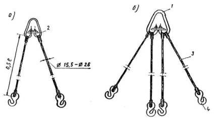 Рис. 1. Стропы для подъема и переноски сваи и шпунта: а - двухветвевые грузоподъемностью до 4 Т; б - четырехветвевые для строповки одновременно двух свай; 1 - скоба грузоподъемностью до 8 Т; 2 - скоба грузоподъемностью до 5 Т; 3 - строп; 4 - крюк