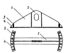 Рис. 2. строповочное устройство для оболочек: 1 - элемент таврового сечения; 2 - накладка; 3 - уголок; 4 - ребра жесткости