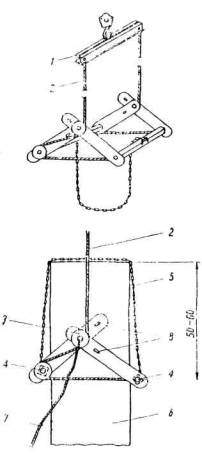 Рис. 9. Схема сборки копра: 1 - подъемная мачта; 2 - расчалка; 3 - опорные винты; 4-распорки из профильного металла или бревен; 5 - стрела копра; 6 - котел с лебедкой; 7 - нижняя тележка; 8 - поворотная платформа копра; 9 - якорь 3.15. Работы по сборке и разборке копра выполняет звено рабочих, состав которого зависит от типа копра (табл. 1). 3. Буровое оборудование3.16. Для производства буровых работ при устройстве опирания оболочек или столбов на основание из скальных пород, а также для преодоления топких скальных прослоек при погружении оболочек следует использовать станки ударно-канатного бурения УКС-30 с литыми долотами. При небольшом объеме бурения в скальных породах работы можно производить тем же долотом, подвешенным к крану или копру.